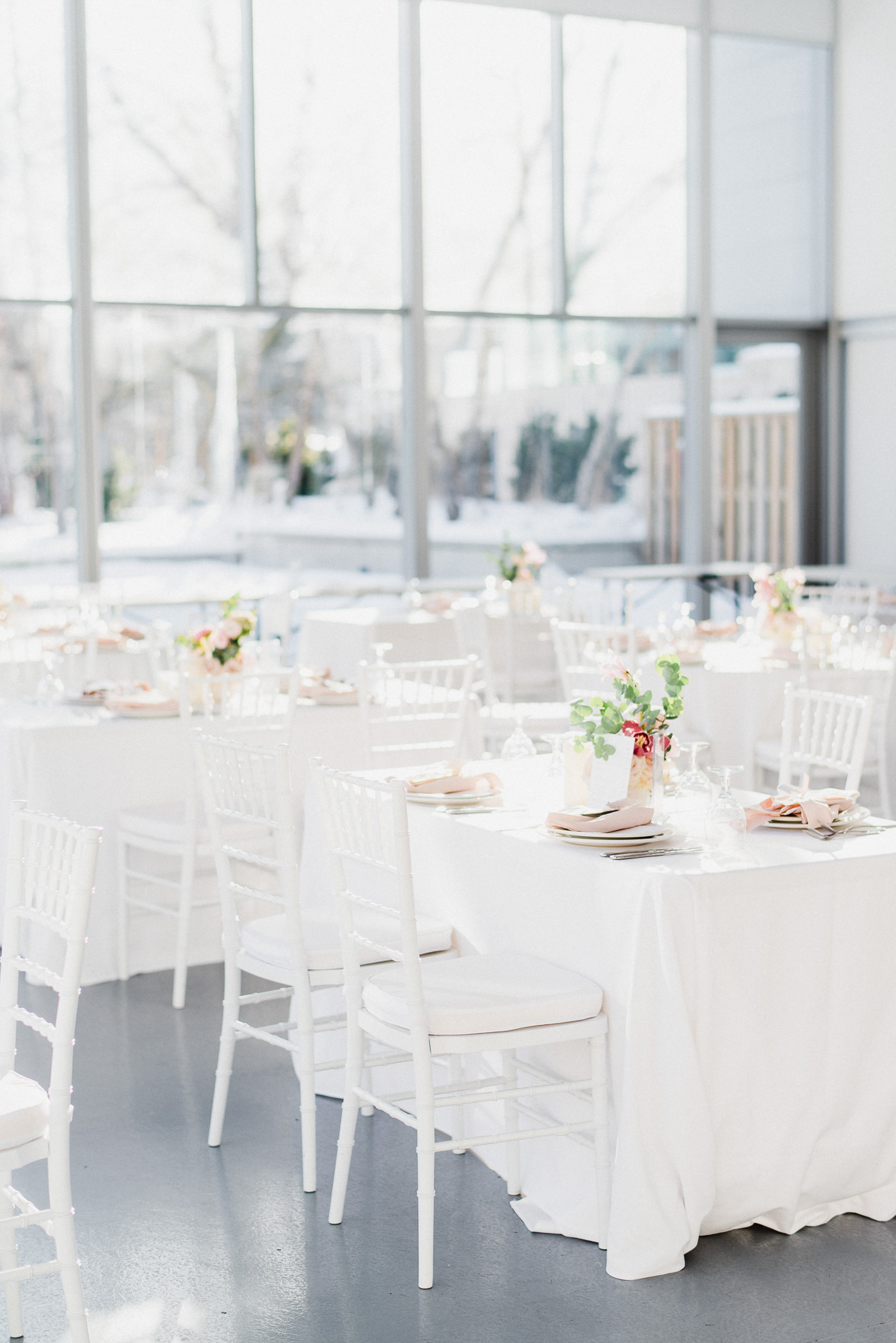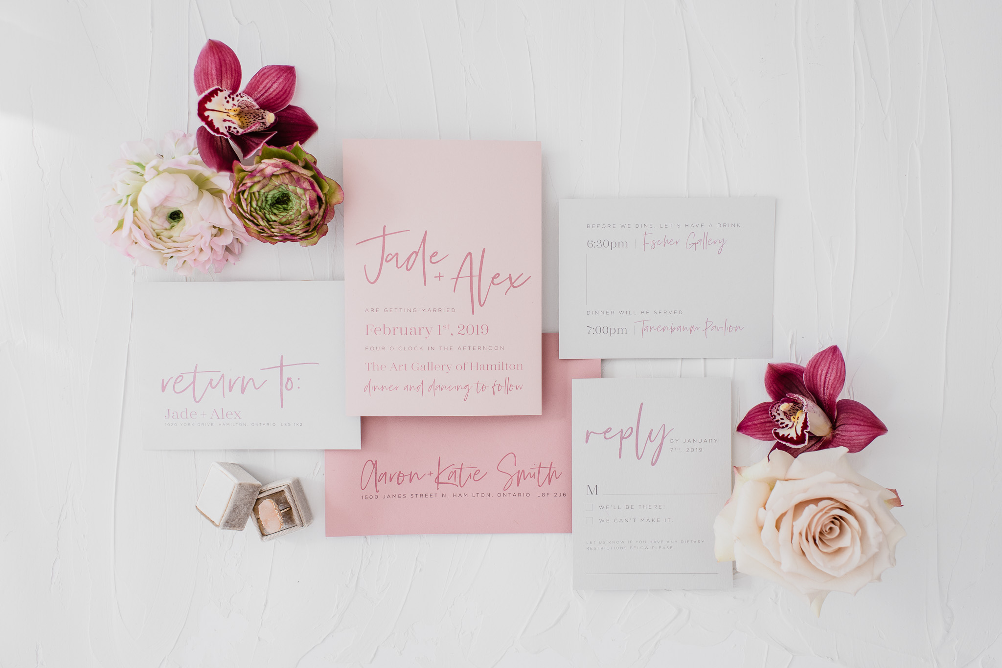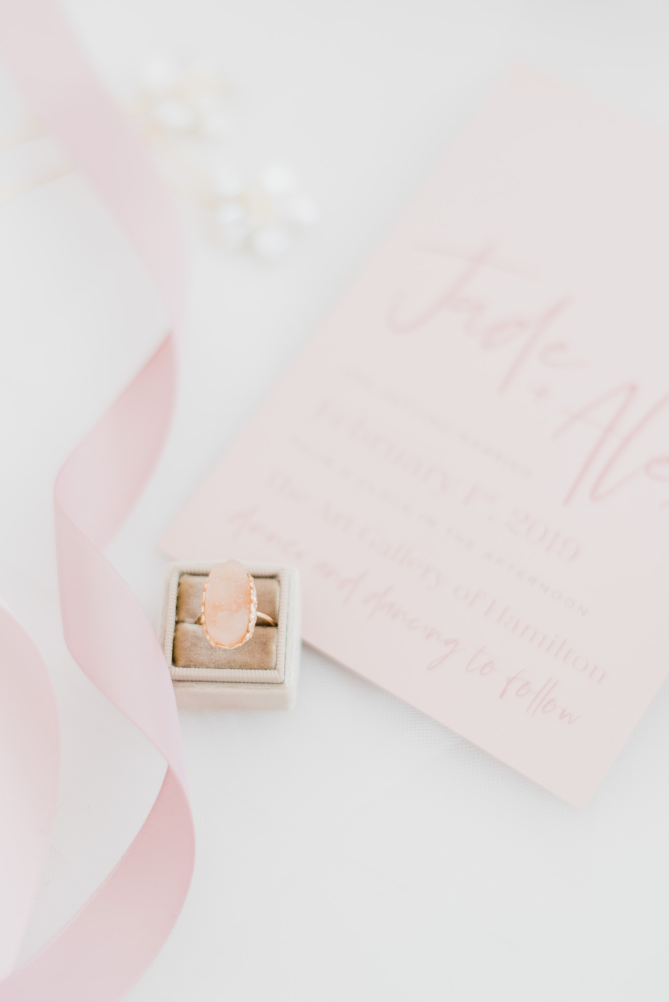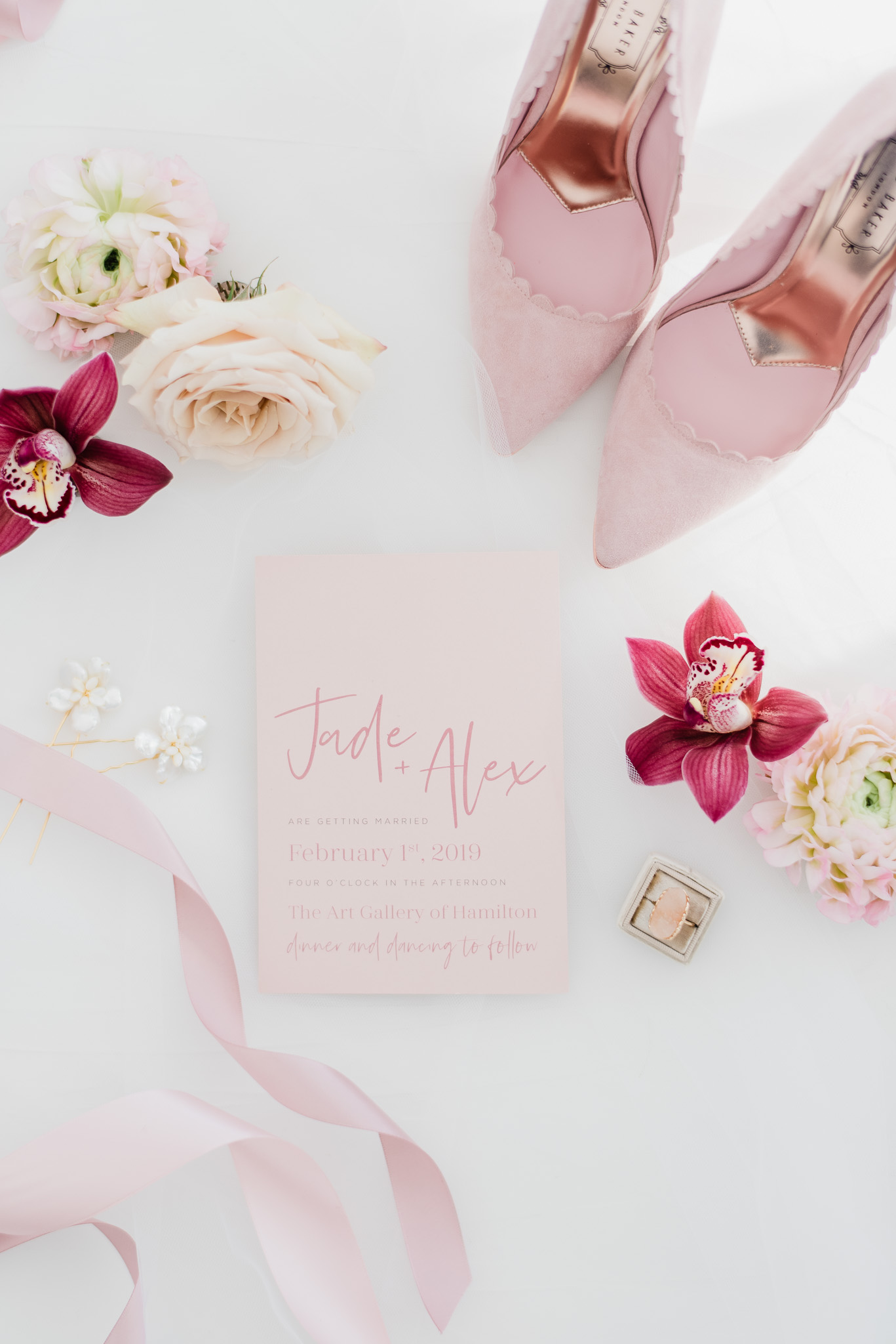 I’m so grateful that I was asked to be a part of this stunning Art Gallery of Hamilton wedding editorial, which is featured over on Weddingbells today! Creative photoshoots like this are so fun to be a part of. Sometimes ‘styled shoots’ get a bad rap, because they aren’t exactly a true representation of what weddings are like, which is true. We aren’t dealing with timeline crunches, rarely have to worry about the weather, and have full control of all lighting and setups. But the beauty in these is that they are meant to invoke inspiration for to-be-wed couples. This particular editorial highlights a new and exciting colour palette, with many layers of pinks and peaches, a bold suit colour choice for the groom (which I LOVE) and stunning tabletop ideas (I mean…velvet napkins?!)