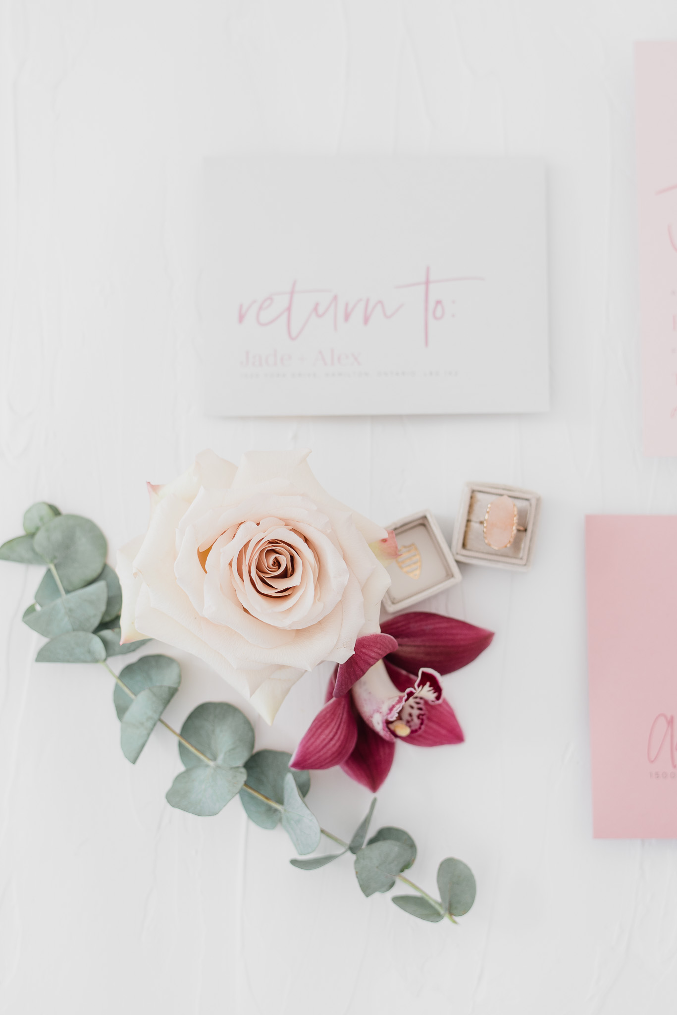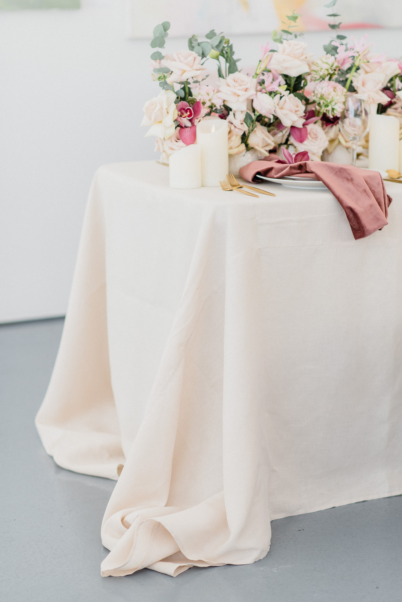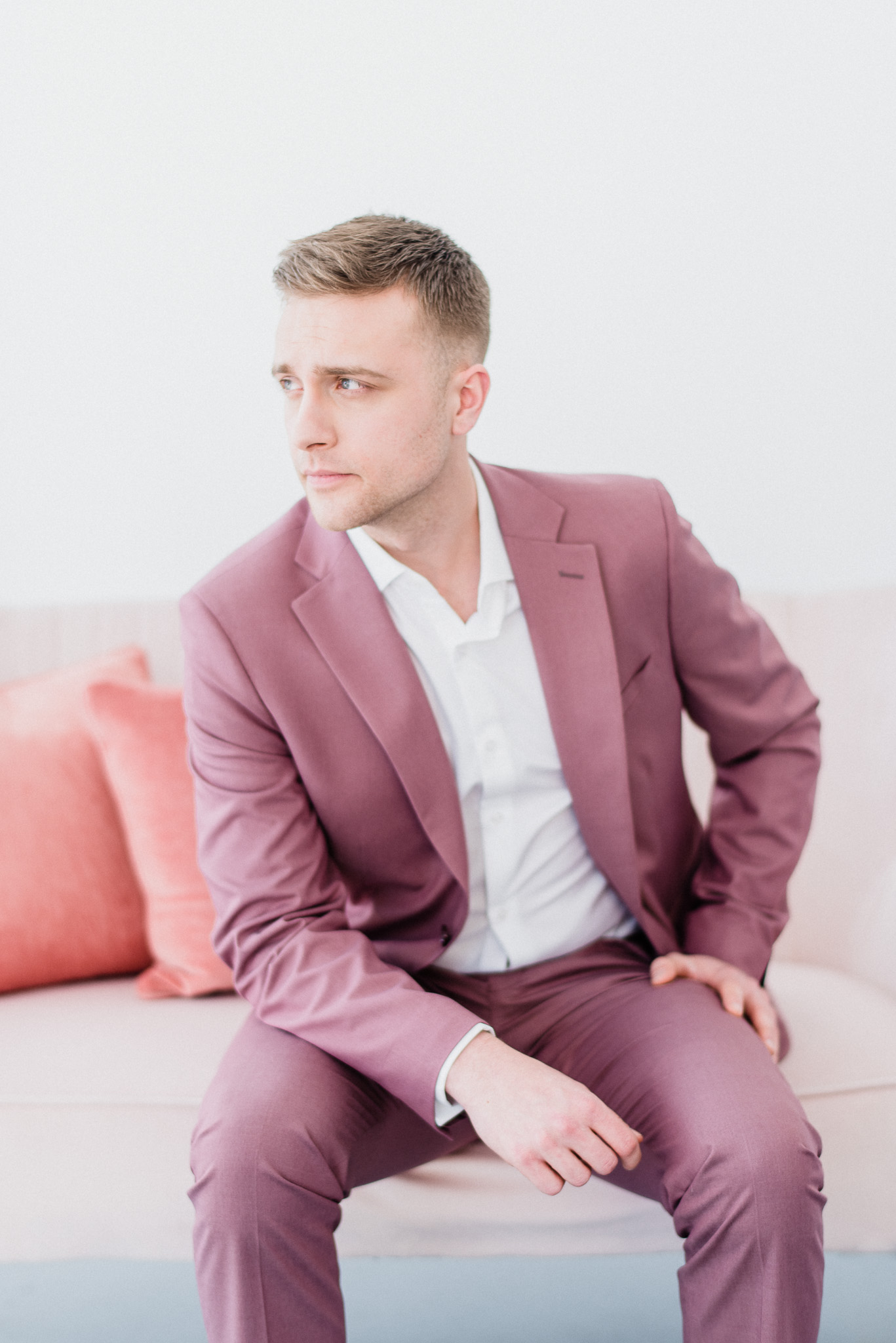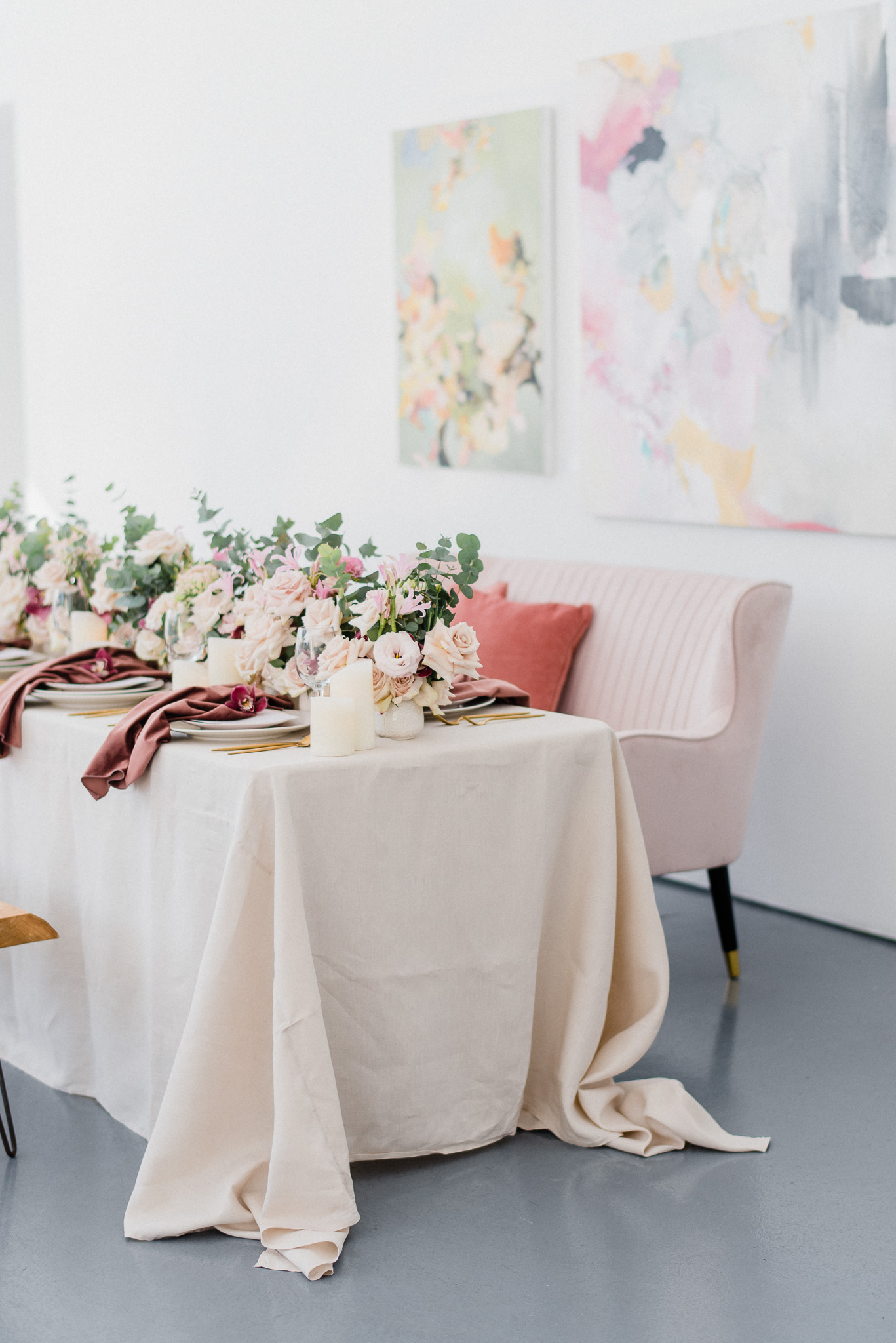I’m so grateful that I was asked to be a part of this stunning Art Gallery of Hamilton wedding editorial, which is featured over on Weddingbells today! Creative photoshoots like this are so fun to be a part of. Sometimes ‘styled shoots’ get a bad rap, because they aren’t exactly a true representation of what weddings are like, which is true. We aren’t dealing with timeline crunches, rarely have to worry about the weather, and have full control of all lighting and setups. But the beauty in these is that they are meant to invoke inspiration for to-be-wed couples. This particular editorial highlights a new and exciting colour palette, with many layers of pinks and peaches, a bold suit colour choice for the groom (which I LOVE) and stunning tabletop ideas (I mean…velvet napkins?!)