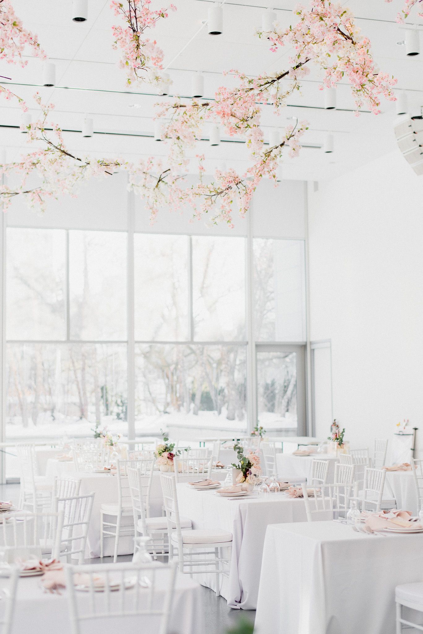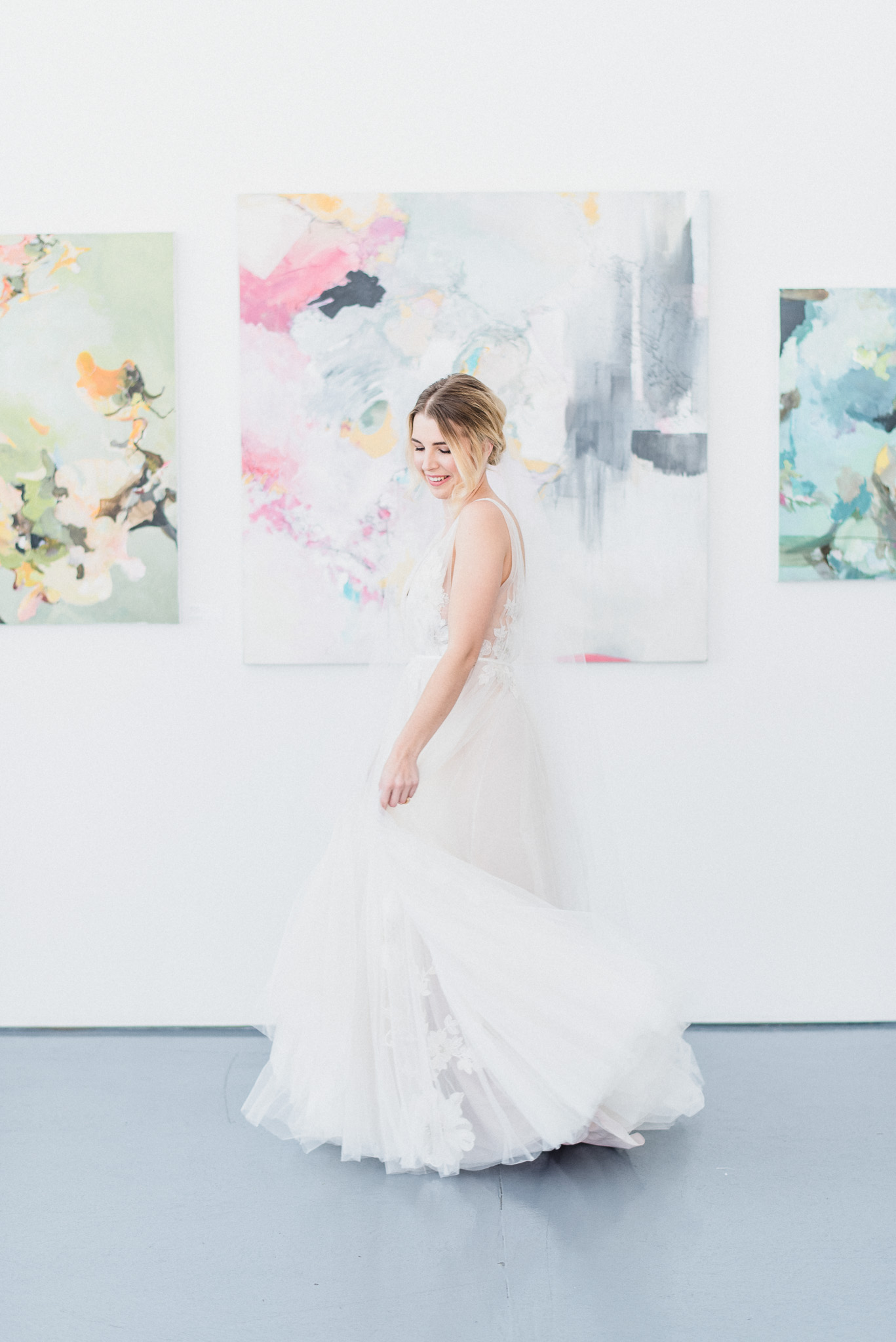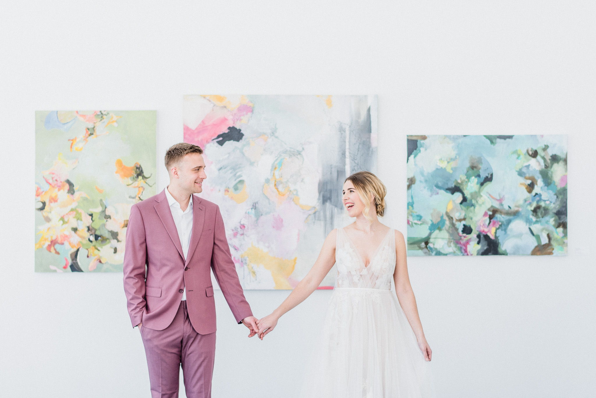 Venue: Art Gallery of Hamilton | Creative Direction, Florals & Styling: Sue Gallo Designs | Coordination & Styling: Vivian Lyttle Events | Stationery: Simply Sealed | Lounge Furniture: Warehouse 84 | Linens & | Tableware: Simply Beautiful Decor | Gown: Willow by Watters via Sash & Bustle | Veils & Accessories: Noon on the Moon | Bridal Shoes: Ted Baker | Suit: RW&CO. | Hair & Make-up: Bespoke Beauty | Cake & Treats: The Dessert Room | Artwork: Cathy Yantsis via Art Gallery of Hamilton Sales | Models: Magna Arnott & Terry Molinaro