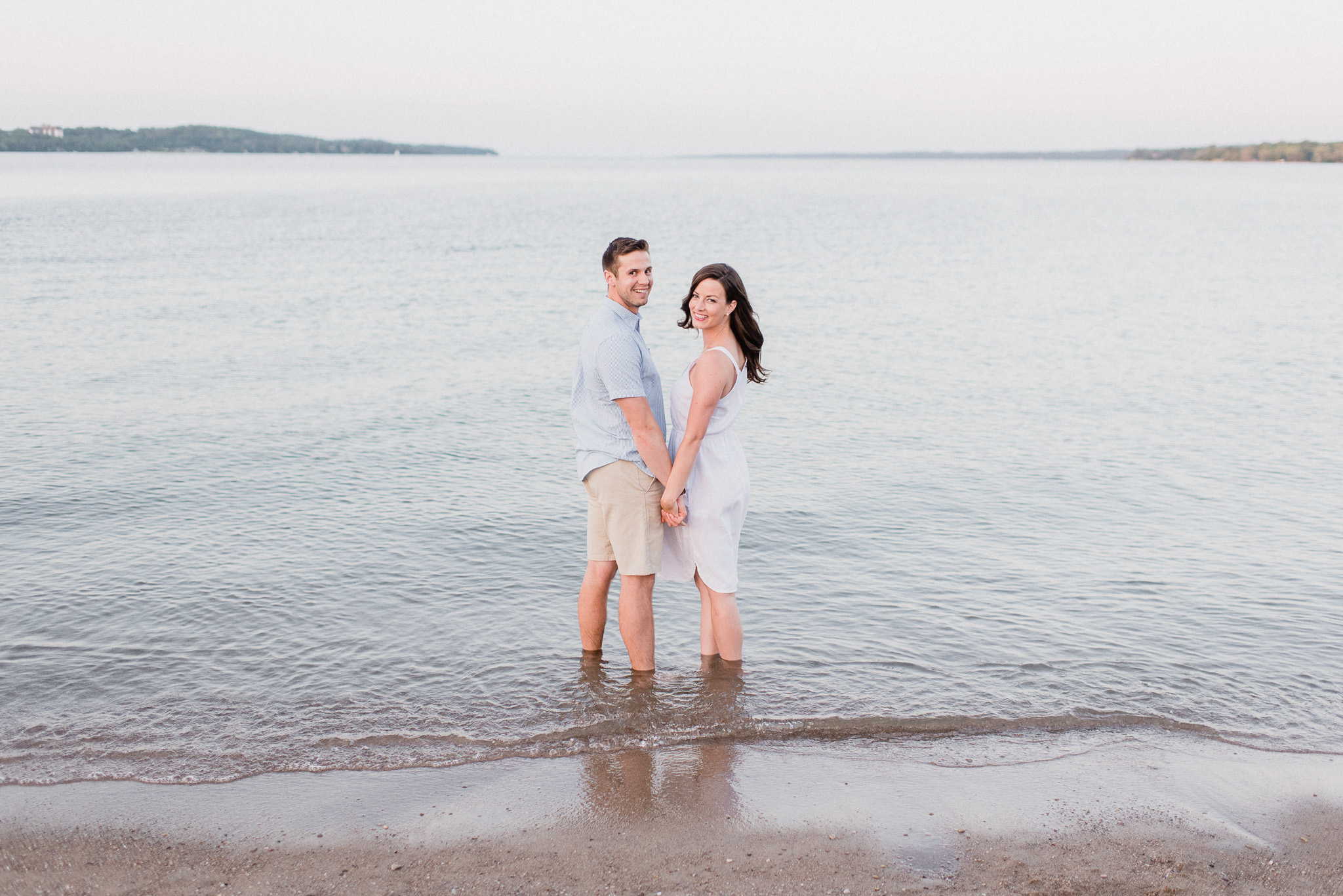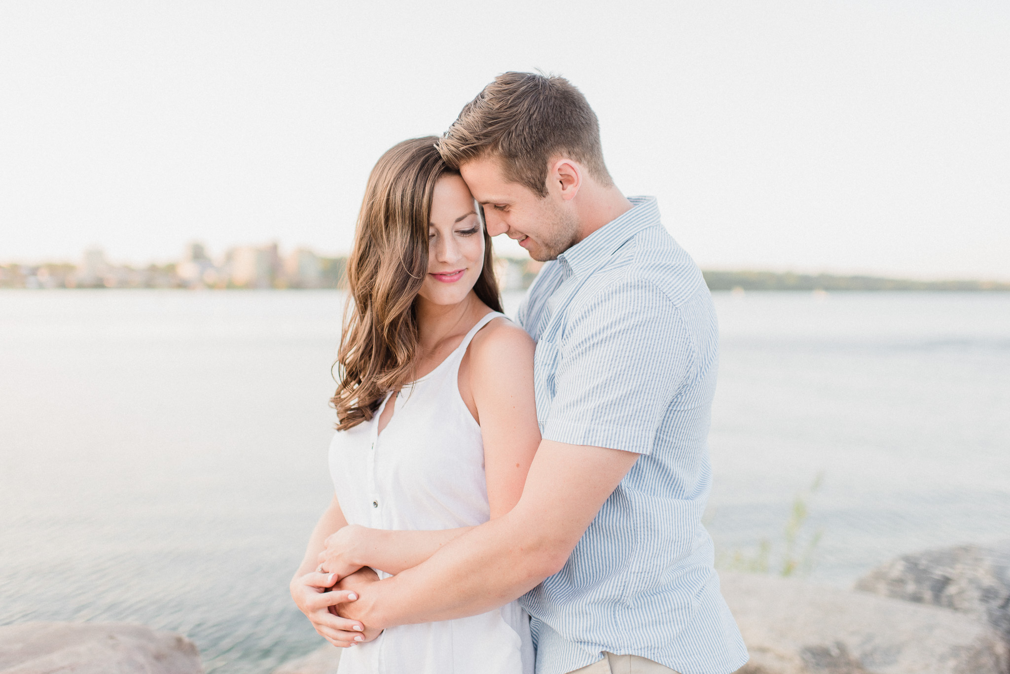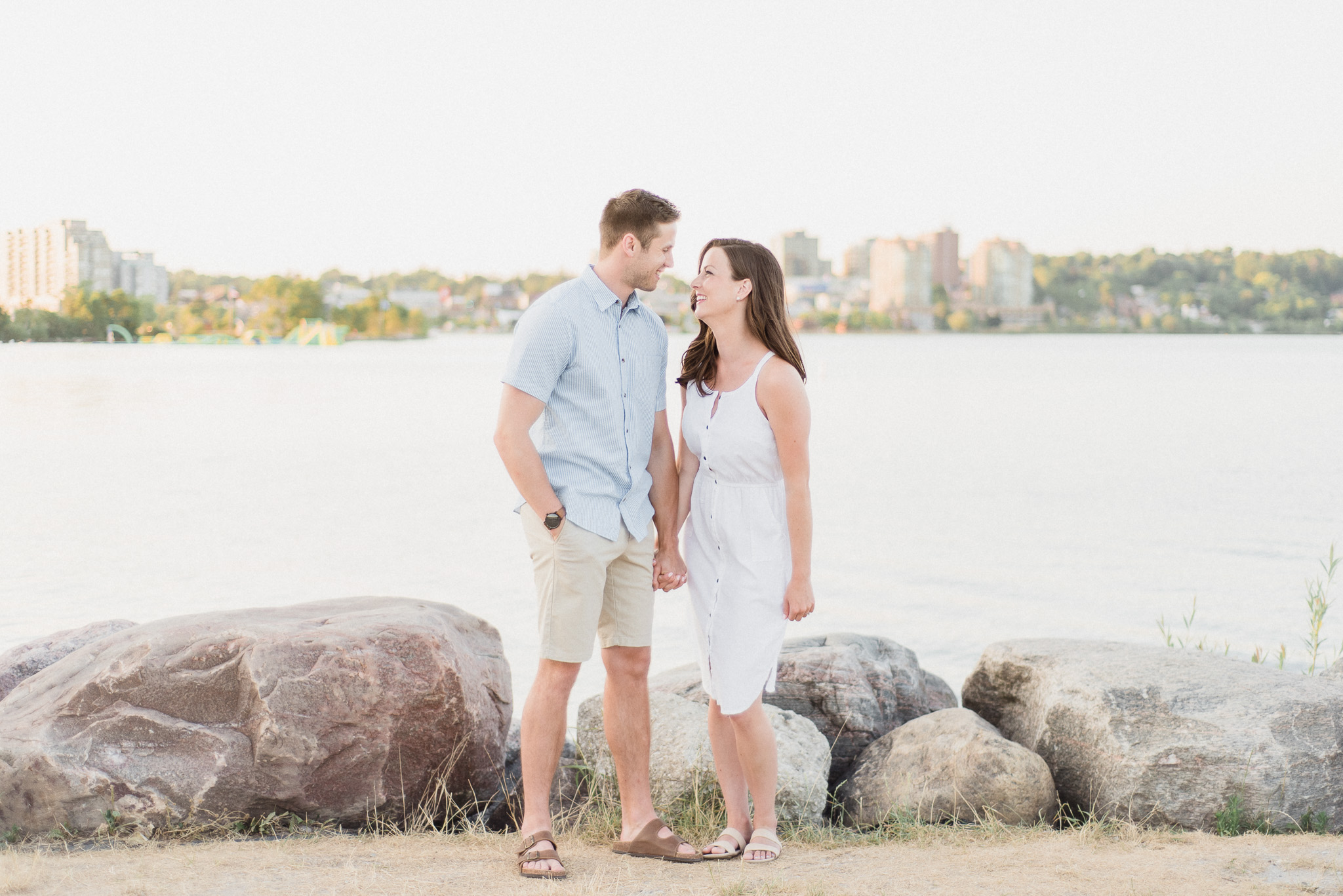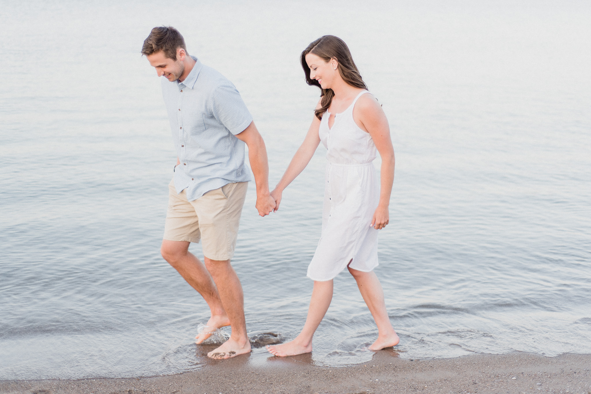 Emily and Matt’s bright and airy Barrie engagement session was scheduled on the perfect July evening. The heat wave had finally broken, and we enjoyed a beautiful sunny evening with the perfect breeze. Just as we arrived down at the beach, everyone was clearing out for the evening, taking the kids home for bed, leaving us with a perfect and nearly empty beach. From where we stood by the water, Emily and Matt pointed out to me the direction across the water where they had grown up, gone to school, and even the little bay where her parents live. They had a little laugh when I set them up in an apparently very ‘typical Barrie photo spot’, with a bit of the Barrie skyline behind them and the water glistening. Even though it might be a good ‘go to’ spot, I love that these guys kept their locations meaningful and familiar, and all within about 10 minutes of where they’ll be getting married next summer. These two are tying the knot in exactly a year today, on July 13th 2019 and I’m super stoked to be documenting it for them! Emily and Matt are such kind and sweet souls, so I know their families and friends are going to be equally wonderful and I can’t wait to meet them all.