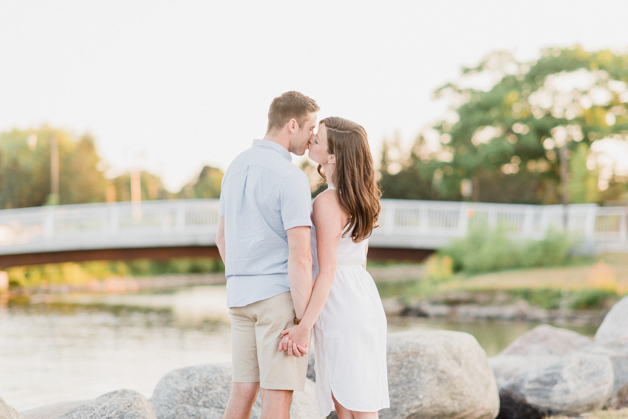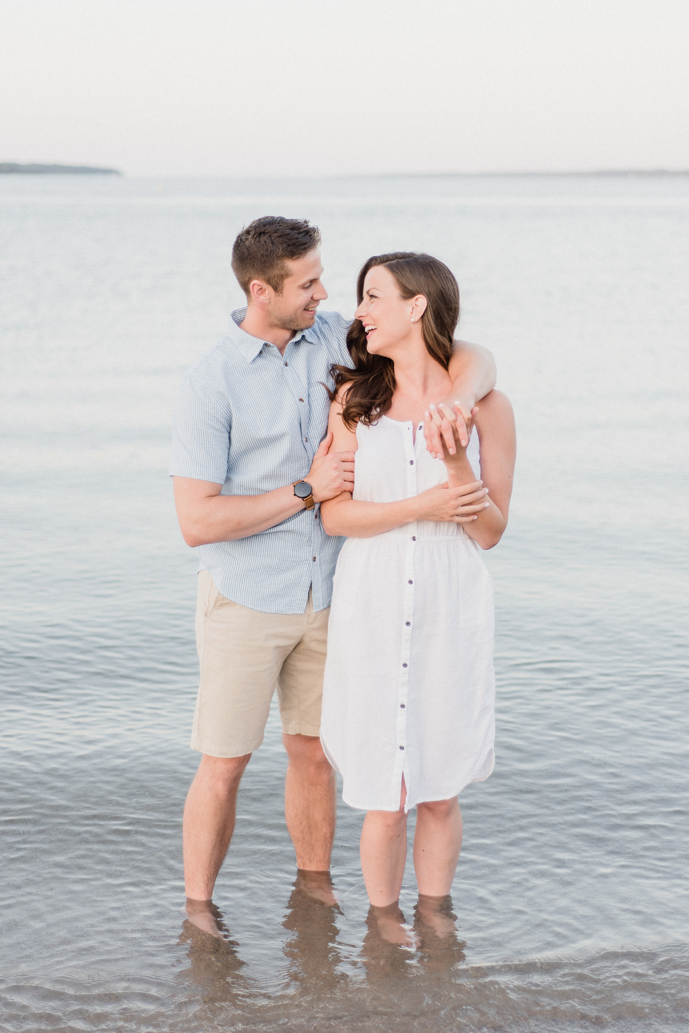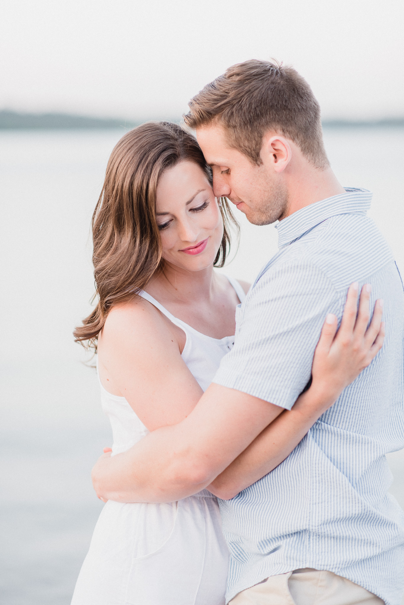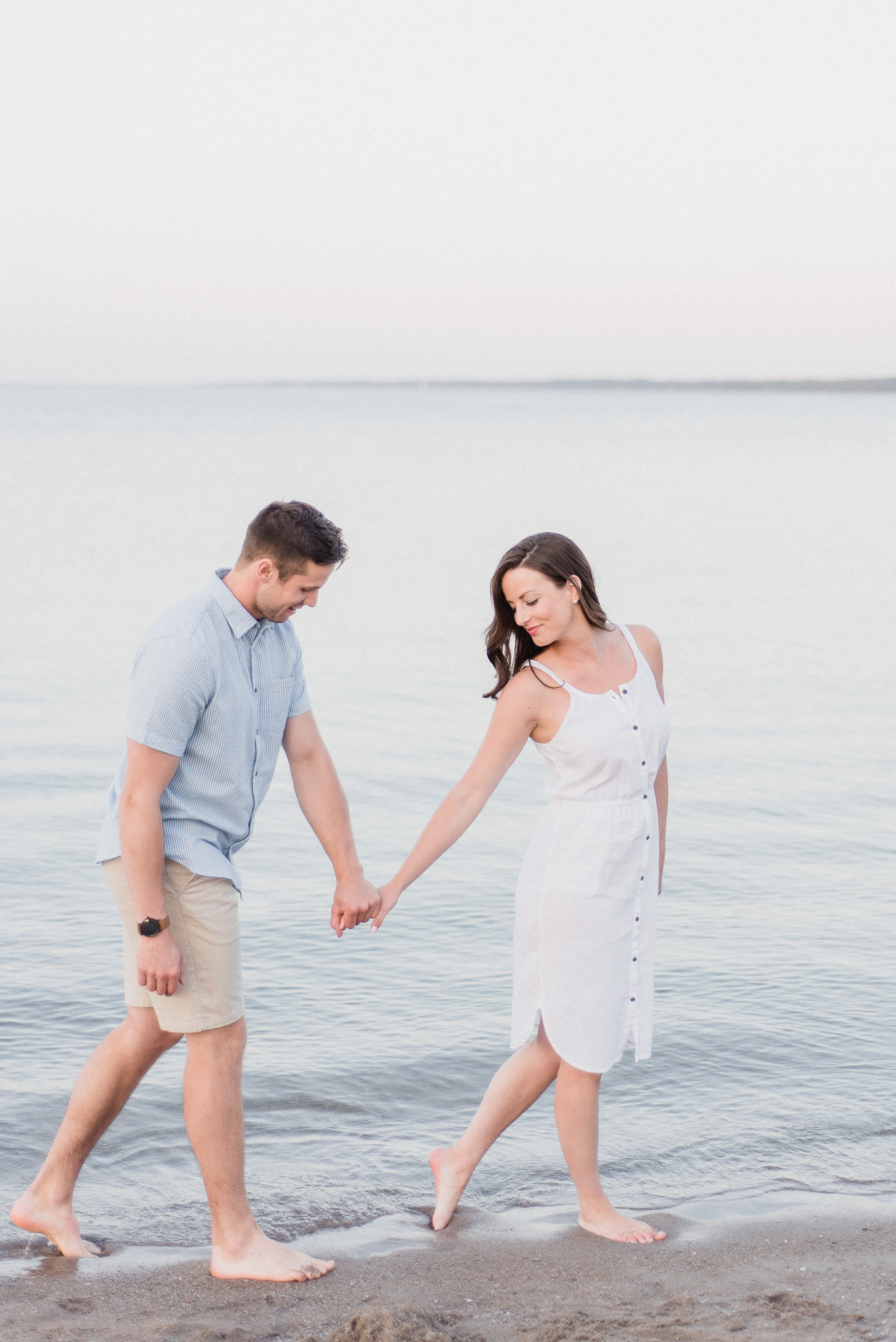 Emily and Matt’s bright and airy Barrie engagement session was scheduled on the perfect July evening. The heat wave had finally broken, and we enjoyed a beautiful sunny evening with the perfect breeze. Just as we arrived down at the beach, everyone was clearing out for the evening, taking the kids home for bed, leaving us with a perfect and nearly empty beach. From where we stood by the water, Emily and Matt pointed out to me the direction across the water where they had grown up, gone to school, and even the little bay where her parents live. They had a little laugh when I set them up in an apparently very ‘typical Barrie photo spot’, with a bit of the Barrie skyline behind them and the water glistening. Even though it might be a good ‘go to’ spot, I love that these guys kept their locations meaningful and familiar, and all within about 10 minutes of where they’ll be getting married next summer. These two are tying the knot in exactly a year today, on July 13th 2019 and I’m super stoked to be documenting it for them! Emily and Matt are such kind and sweet souls, so I know their families and friends are going to be equally wonderful and I can’t wait to meet them all.