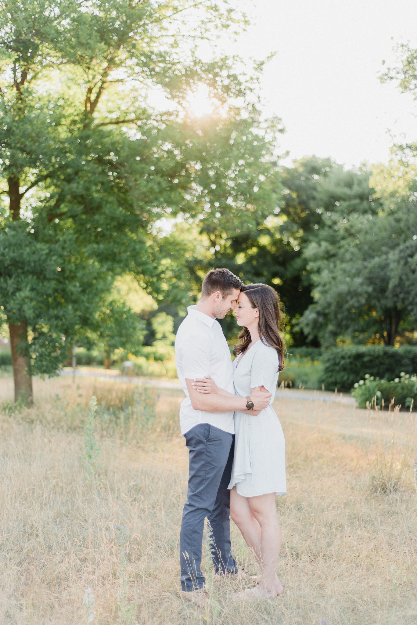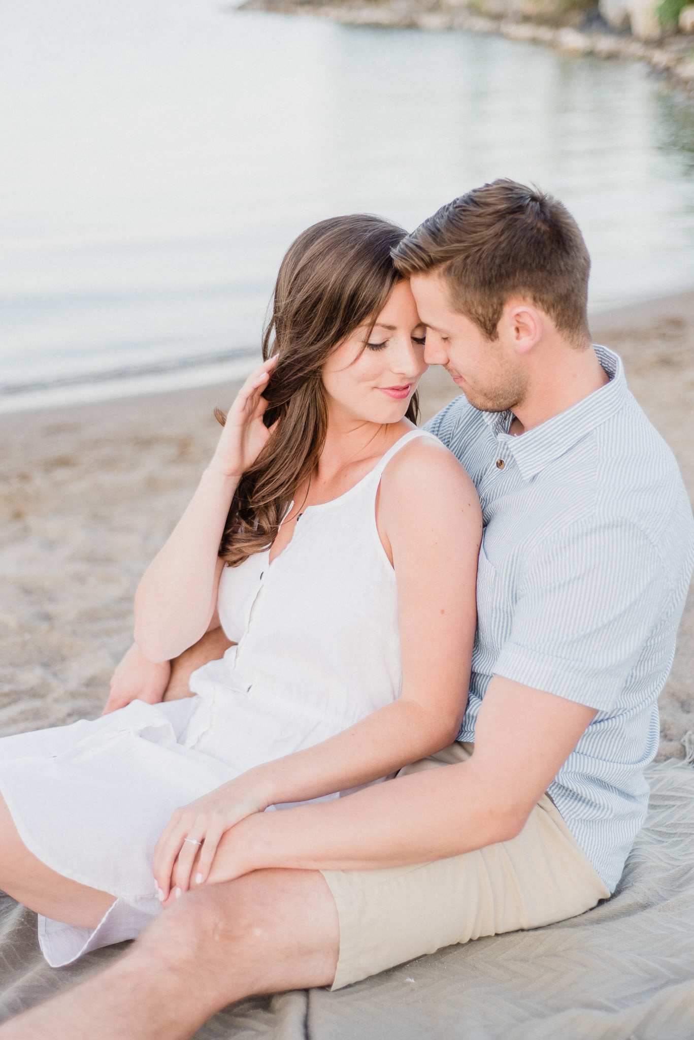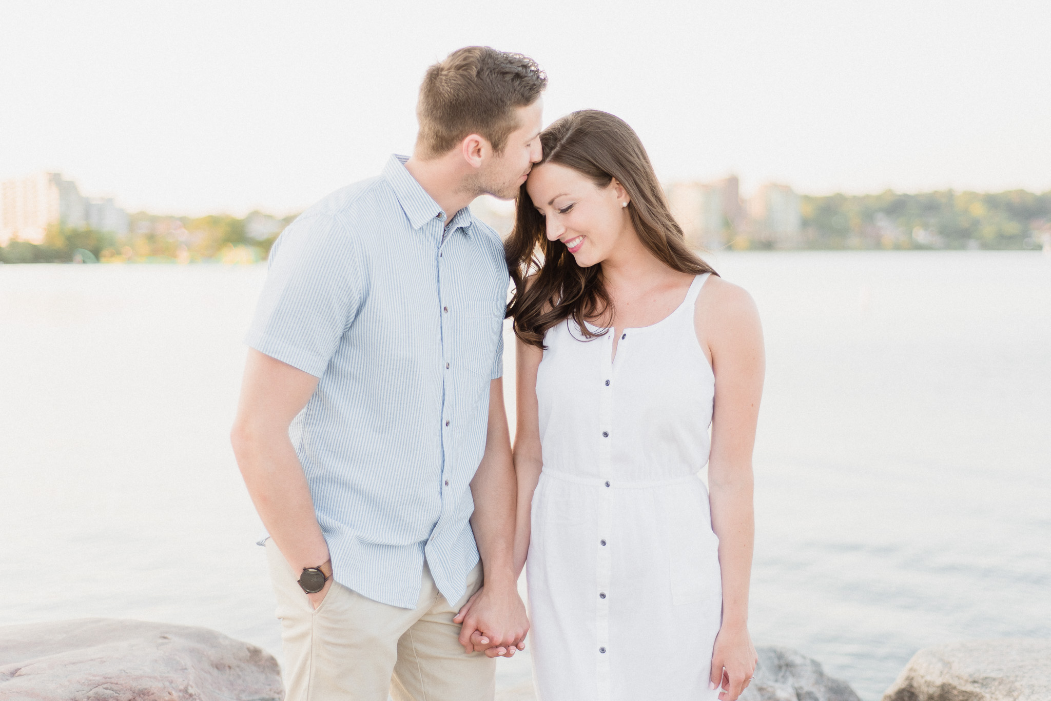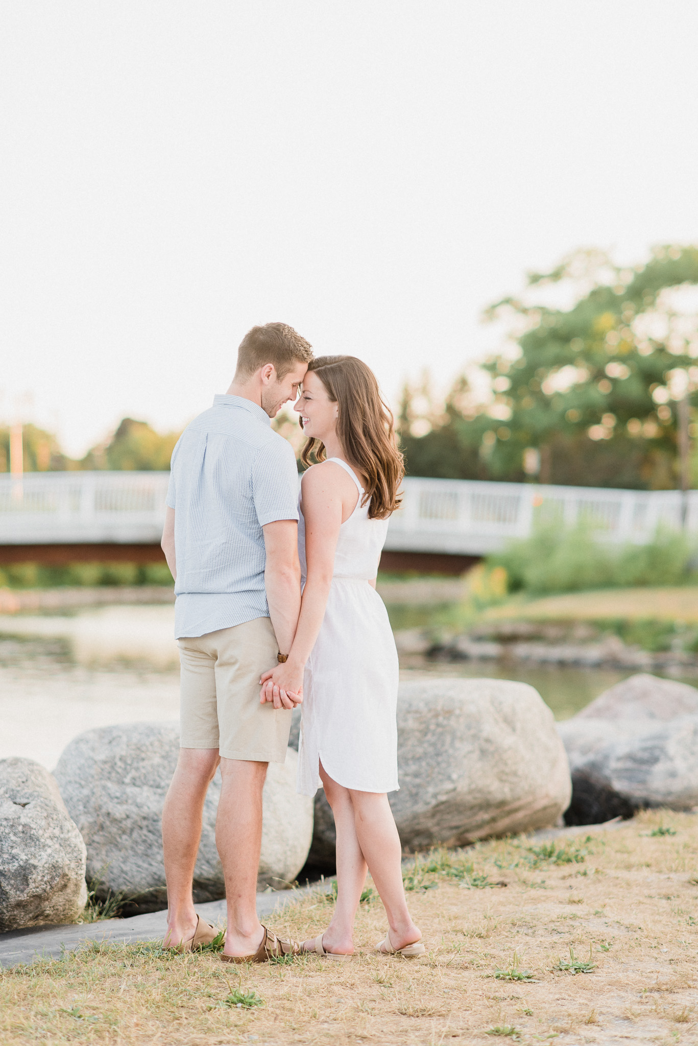 Emily and Matt’s bright and airy Barrie engagement session was scheduled on the perfect July evening. The heat wave had finally broken, and we enjoyed a beautiful sunny evening with the perfect breeze. Just as we arrived down at the beach, everyone was clearing out for the evening, taking the kids home for bed, leaving us with a perfect and nearly empty beach. From where we stood by the water, Emily and Matt pointed out to me the direction across the water where they had grown up, gone to school, and even the little bay where her parents live. They had a little laugh when I set them up in an apparently very ‘typical Barrie photo spot’, with a bit of the Barrie skyline behind them and the water glistening. Even though it might be a good ‘go to’ spot, I love that these guys kept their locations meaningful and familiar, and all within about 10 minutes of where they’ll be getting married next summer. These two are tying the knot in exactly a year today, on July 13th 2019 and I’m super stoked to be documenting it for them! Emily and Matt are such kind and sweet souls, so I know their families and friends are going to be equally wonderful and I can’t wait to meet them all.