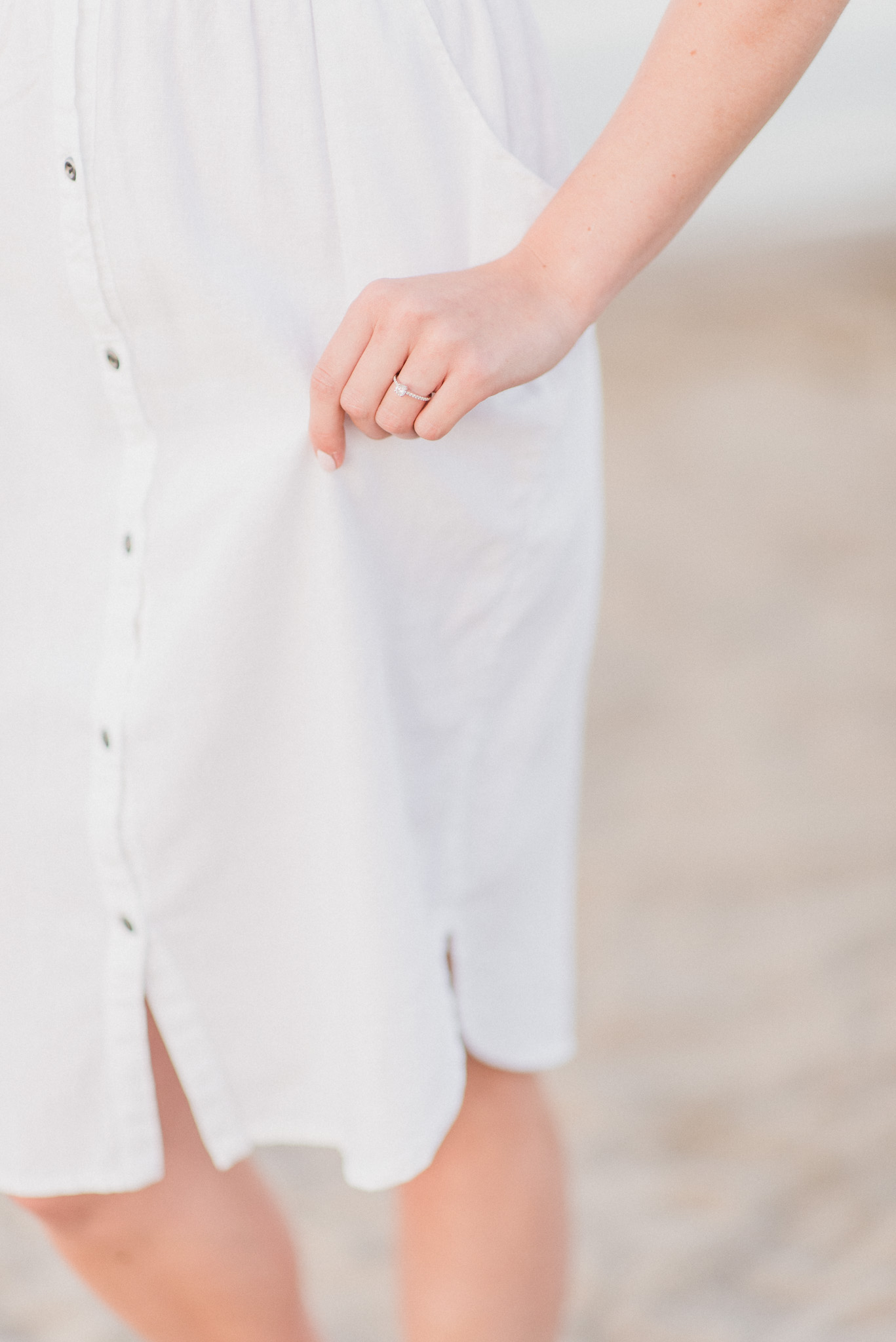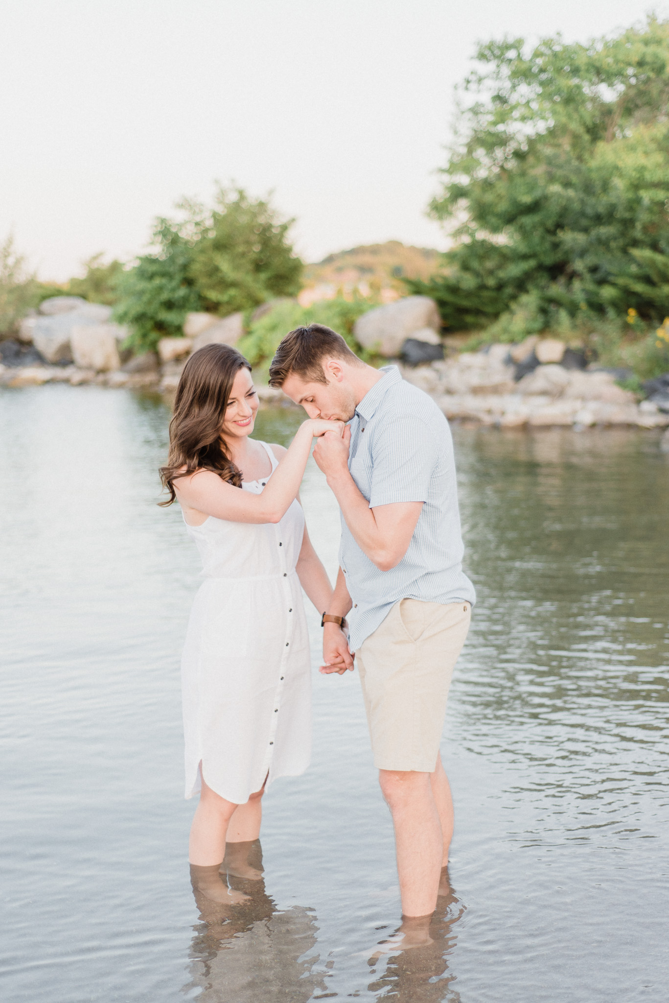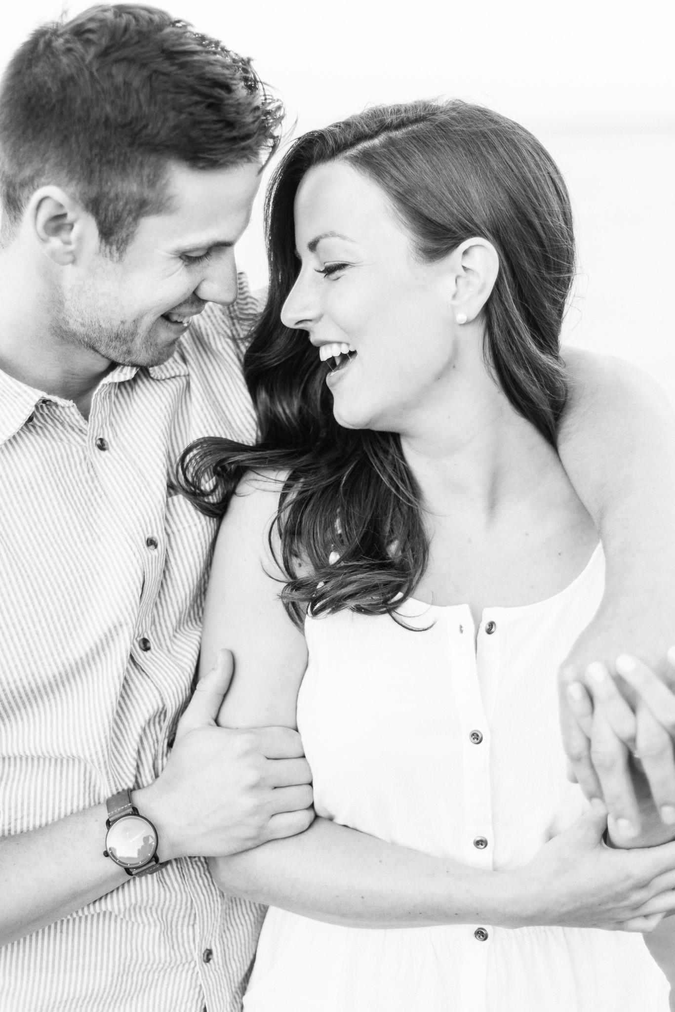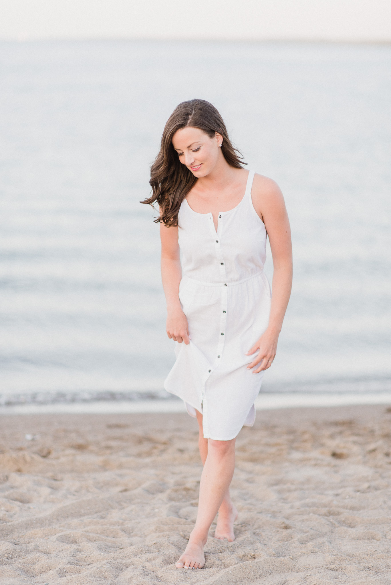 Emily and Matt’s bright and airy Barrie engagement session was scheduled on the perfect July evening. The heat wave had finally broken, and we enjoyed a beautiful sunny evening with the perfect breeze. Just as we arrived down at the beach, everyone was clearing out for the evening, taking the kids home for bed, leaving us with a perfect and nearly empty beach. From where we stood by the water, Emily and Matt pointed out to me the direction across the water where they had grown up, gone to school, and even the little bay where her parents live. They had a little laugh when I set them up in an apparently very ‘typical Barrie photo spot’, with a bit of the Barrie skyline behind them and the water glistening. Even though it might be a good ‘go to’ spot, I love that these guys kept their locations meaningful and familiar, and all within about 10 minutes of where they’ll be getting married next summer. These two are tying the knot in exactly a year today, on July 13th 2019 and I’m super stoked to be documenting it for them! Emily and Matt are such kind and sweet souls, so I know their families and friends are going to be equally wonderful and I can’t wait to meet them all.