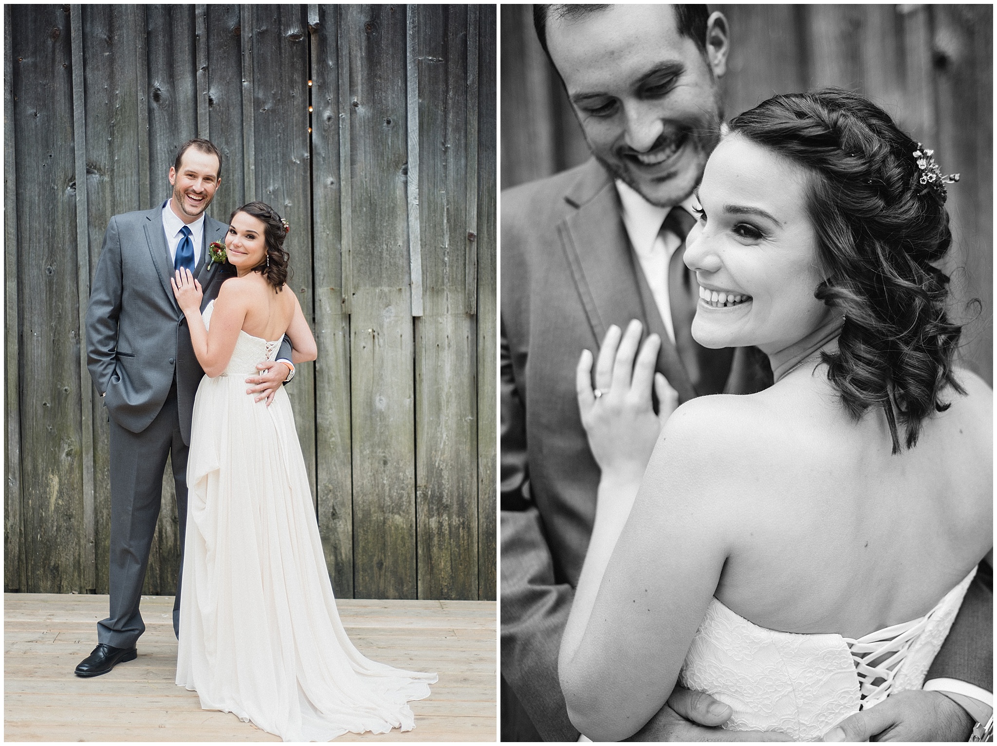 Caitlin and Jeff’s LazyDayz Bed & Breakfast wedding is currently gracing the cover of WeddingTrends magazine! I am SO thrilled to finally be able to share these photos from this beautifully rustic DIY barn wedding. Caitlin and Jeff worked so hard on their wedding, taking care to make sure that all of their guests had a great time and we were well fed! A custom caesar bar complete with all the fixings, homemade jam take-home favours, and a delicious buffet were just a few of the highlights in store for their guests. I was so blown away when I saw their cake setup- antique doors that they found on the side of the road were the perfect rustic backdrop for their gorgeous cake by Cakes by Design.