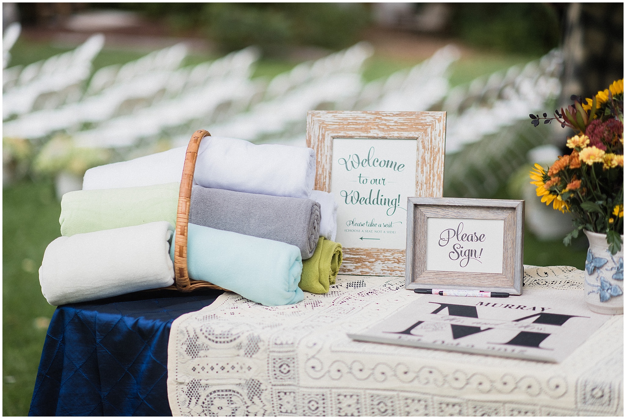 Another thoughtful touch for guests- if it’s going to be chilly and you’re celebrating outdoors, provide some cozy blankets!