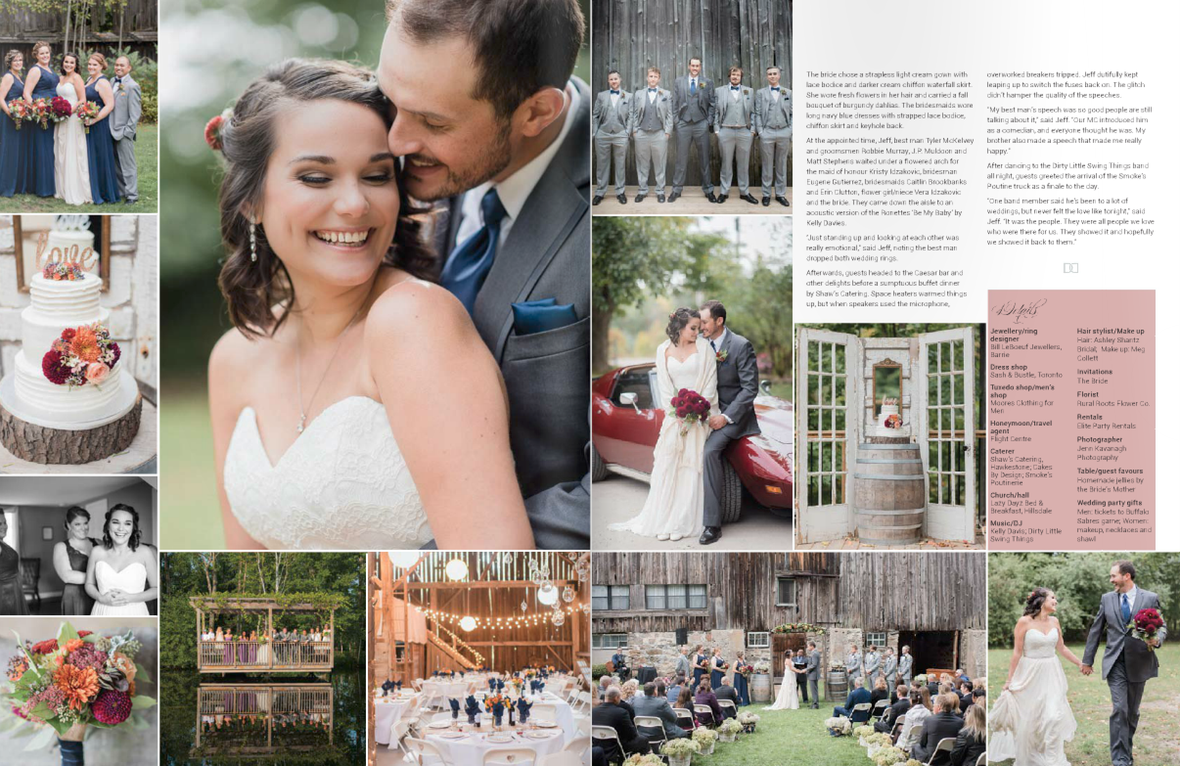 Makeup: Meg Collett Hair: Ashley Shantz Bridal Florals: Rural Roots Flower Co Cake: Cakes by Design Gown: Truvelle from Sash & Bustle Music: Dirty Little Swing Things, Kelly Davies Bridesmaids Gowns: Sophie’s Bridal Suits: Moore’s Rentals: Elite Party Rentals Catering: Shaw’s Catering Late Night: Smoke’s Poutinerie Officiant: Gerry from All Season Weddings Venue: LazyDayz Bed & Breakfast