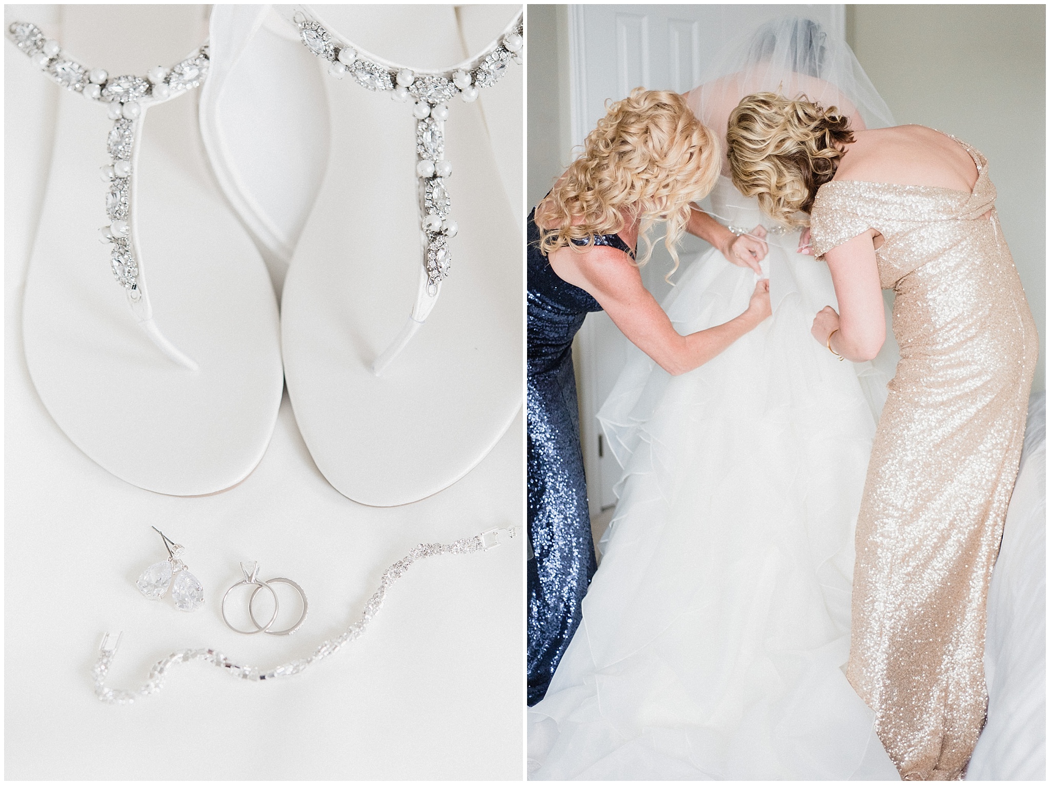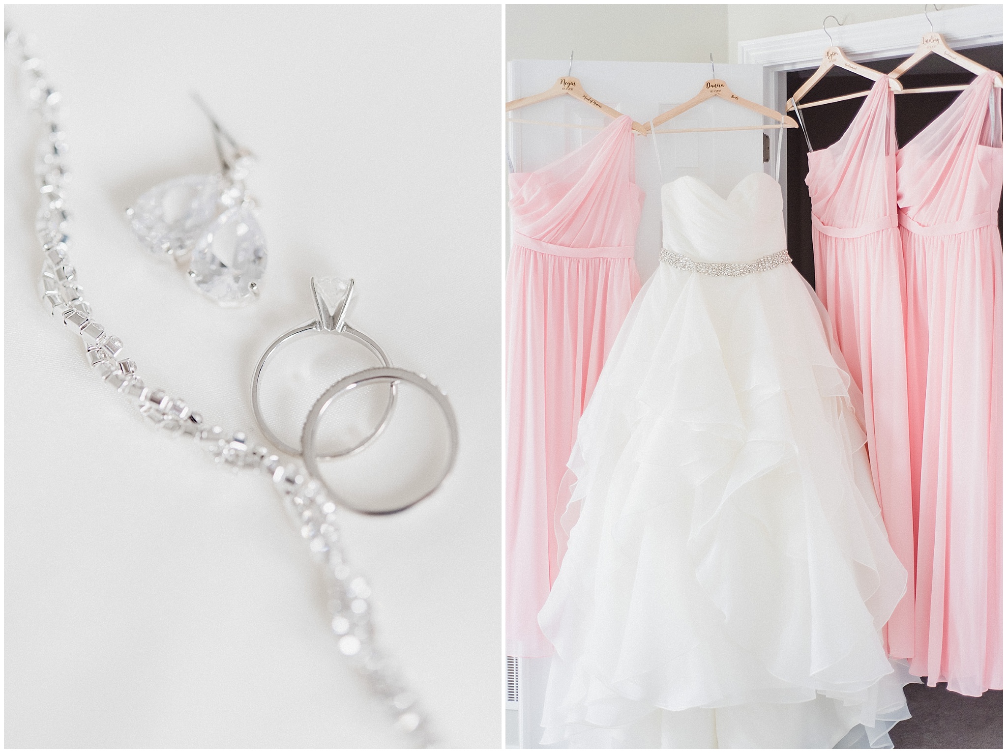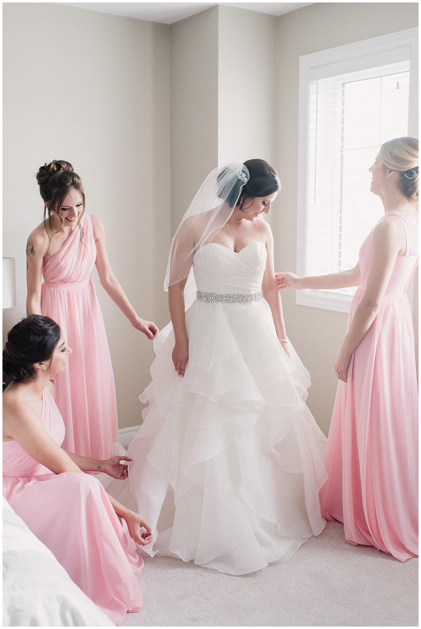 Blush pink bridesmaids helping bride get ready by Jenn Kavanagh Photography