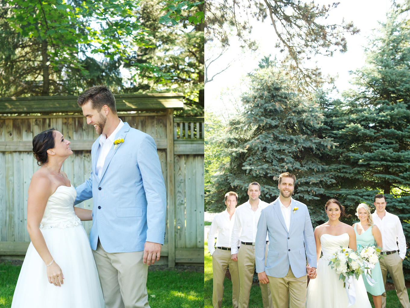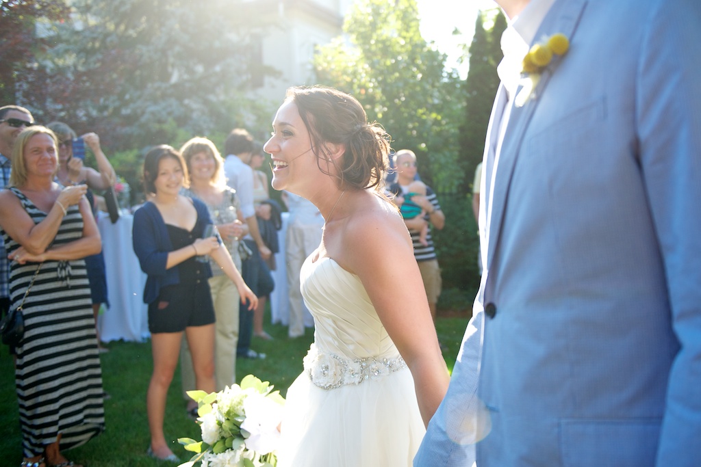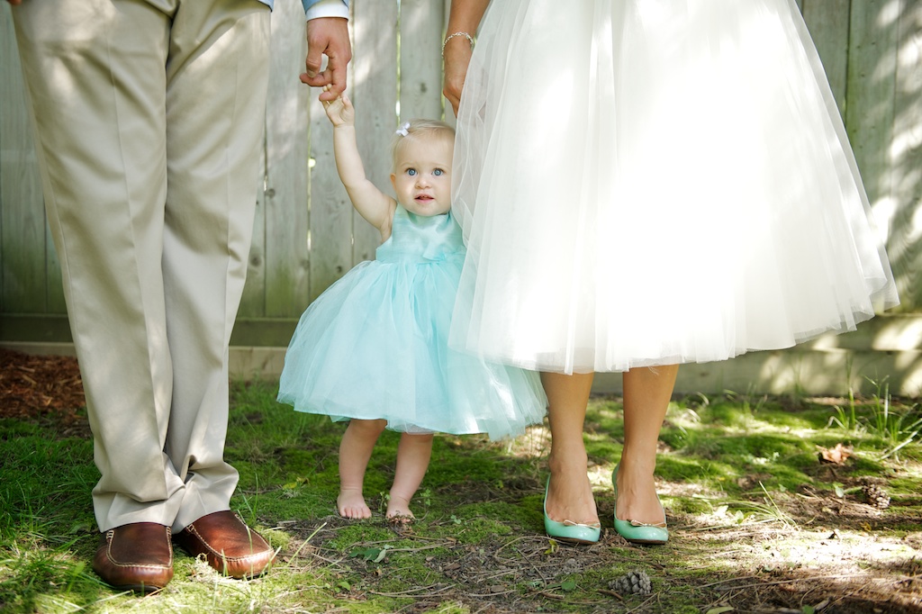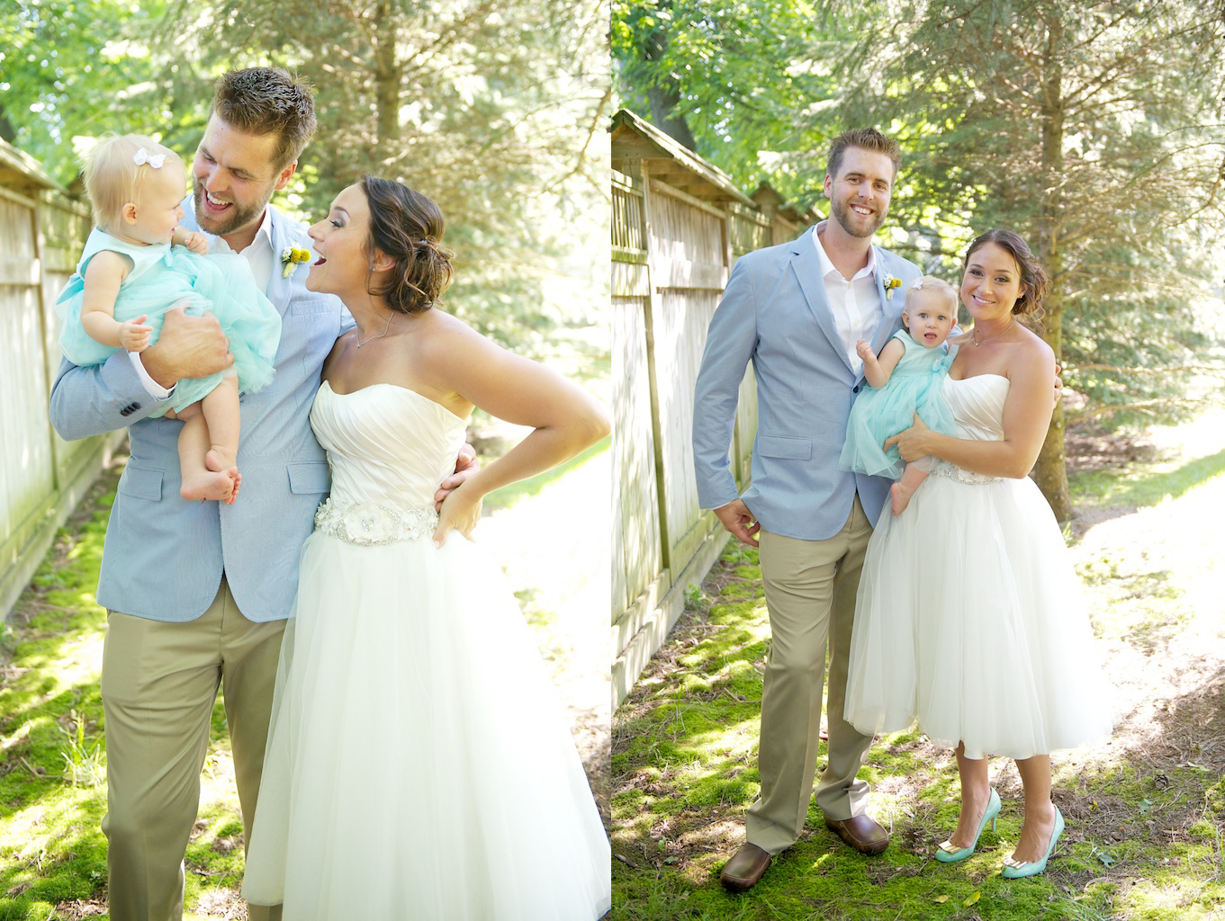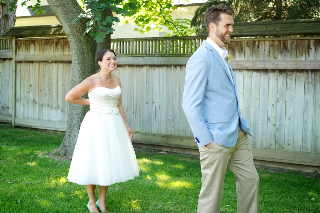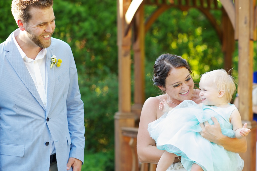 I had been looking forward to Stephanie and Chris’ wedding for months. All along, their closest friends and family thought they’d be celebrating their daughter Evi’s 1st birthday, all the while Steph and Chris has been planning to surprise them with a wedding celebration instead. The day turned out beautifully- I am such a fan of these kinds of weddings! Hosted in Steph’s parents’ backyard, the day was thoughtfully planned out and styled by the uber talented KJ & Co, and Hamilton based Niche Catering kept everyone satisfied with their tasty apps. Pretty in Pink did a great job getting Steph’s hair and makeup ready for her big day, and Setting Stylist made sure she had a beautiful bouquet in hand. Steph wore a beautiful cocktail length Alfred Sung dress, and her mint and gold Kate Spade shoes were the inspiration for the colour palette for the whole day. The happy couple opted to do a First Look, which worked out fabulously because it allowed them to get rid of their pre-ceremony jitters, and it gave us the chance to sneak out of the house to do some photos while the guests were arriving. The ceremony was so special- all of their closest friends and family stood and watched in a circle as Steph and Chris said their tearful vows. The look on Chris’ face (and his brother’s!) as Steph was walking towards him says it all! After Evi had her 1st birthday cake smash, the evening was spent outside with cocktails and hilarious speeches, a chandelier twinkling in the trees and lots of kids running around with bubbles. And of course, lots of love!