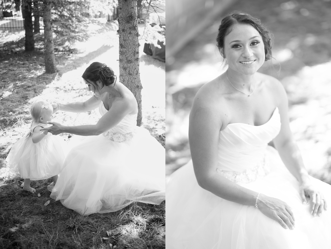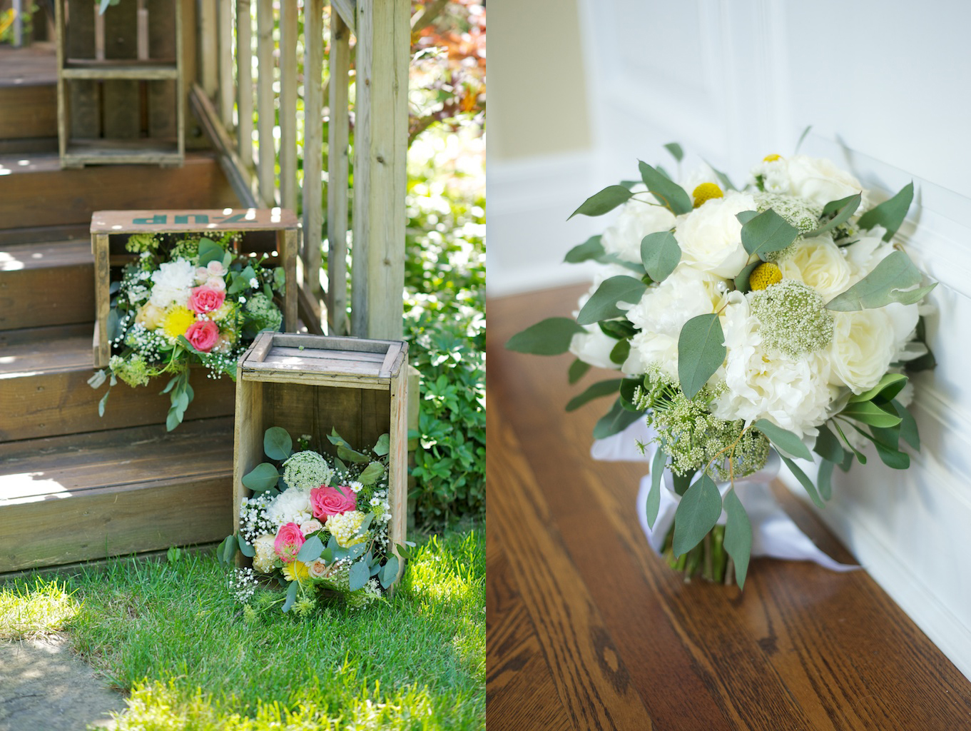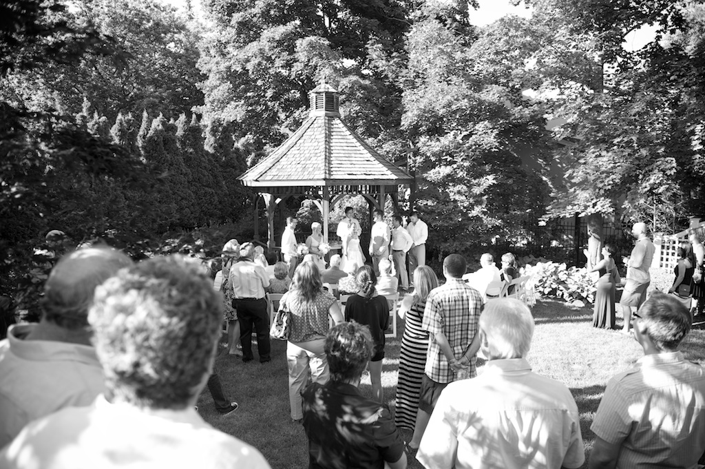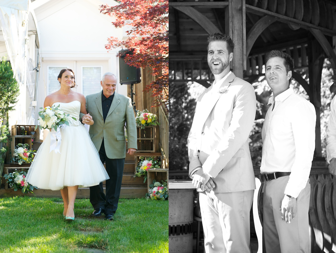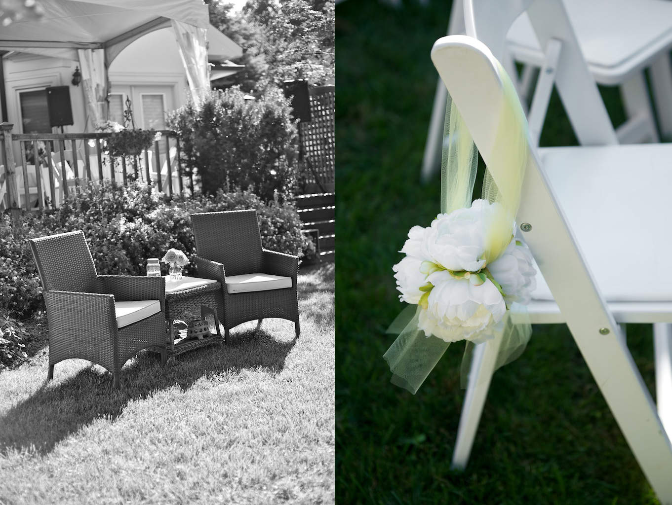 I had been looking forward to Stephanie and Chris’ wedding for months. All along, their closest friends and family thought they’d be celebrating their daughter Evi’s 1st birthday, all the while Steph and Chris has been planning to surprise them with a wedding celebration instead. The day turned out beautifully- I am such a fan of these kinds of weddings! Hosted in Steph’s parents’ backyard, the day was thoughtfully planned out and styled by the uber talented KJ & Co, and Hamilton based Niche Catering kept everyone satisfied with their tasty apps. Pretty in Pink did a great job getting Steph’s hair and makeup ready for her big day, and Setting Stylist made sure she had a beautiful bouquet in hand. Steph wore a beautiful cocktail length Alfred Sung dress, and her mint and gold Kate Spade shoes were the inspiration for the colour palette for the whole day. The happy couple opted to do a First Look, which worked out fabulously because it allowed them to get rid of their pre-ceremony jitters, and it gave us the chance to sneak out of the house to do some photos while the guests were arriving. The ceremony was so special- all of their closest friends and family stood and watched in a circle as Steph and Chris said their tearful vows. The look on Chris’ face (and his brother’s!) as Steph was walking towards him says it all! After Evi had her 1st birthday cake smash, the evening was spent outside with cocktails and hilarious speeches, a chandelier twinkling in the trees and lots of kids running around with bubbles. And of course, lots of love!