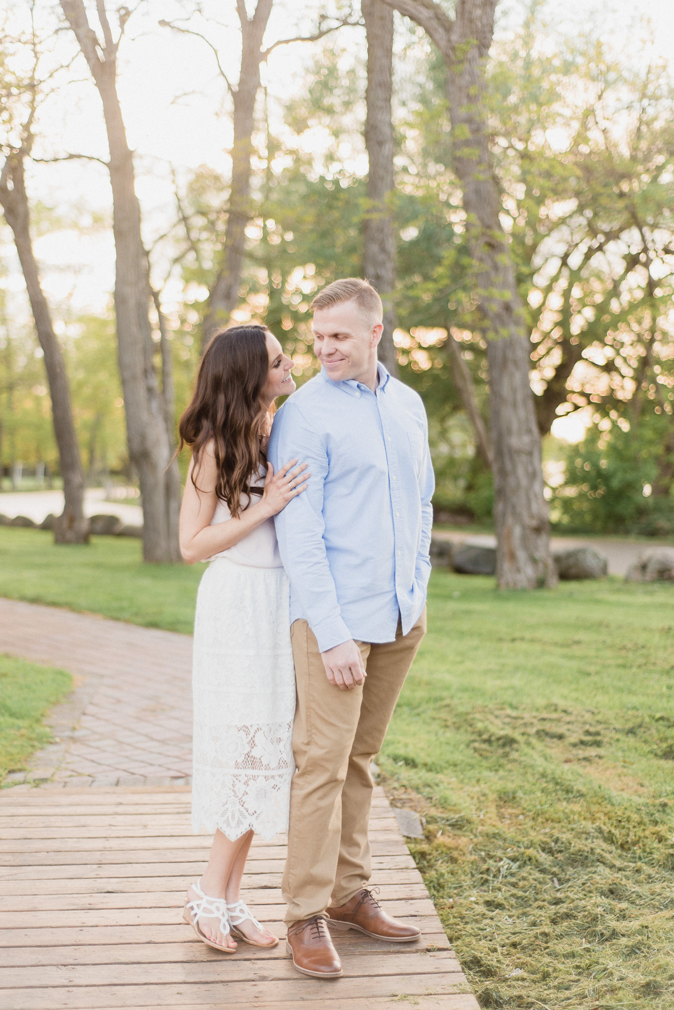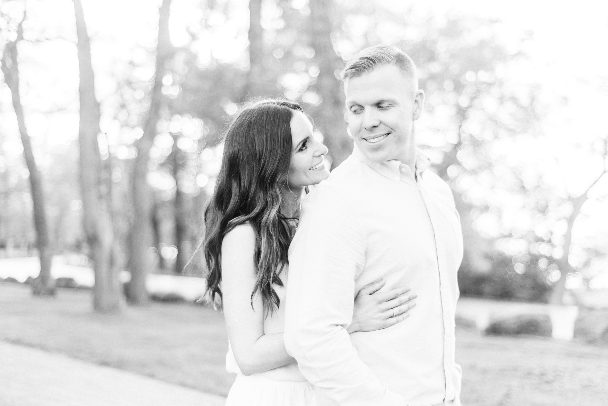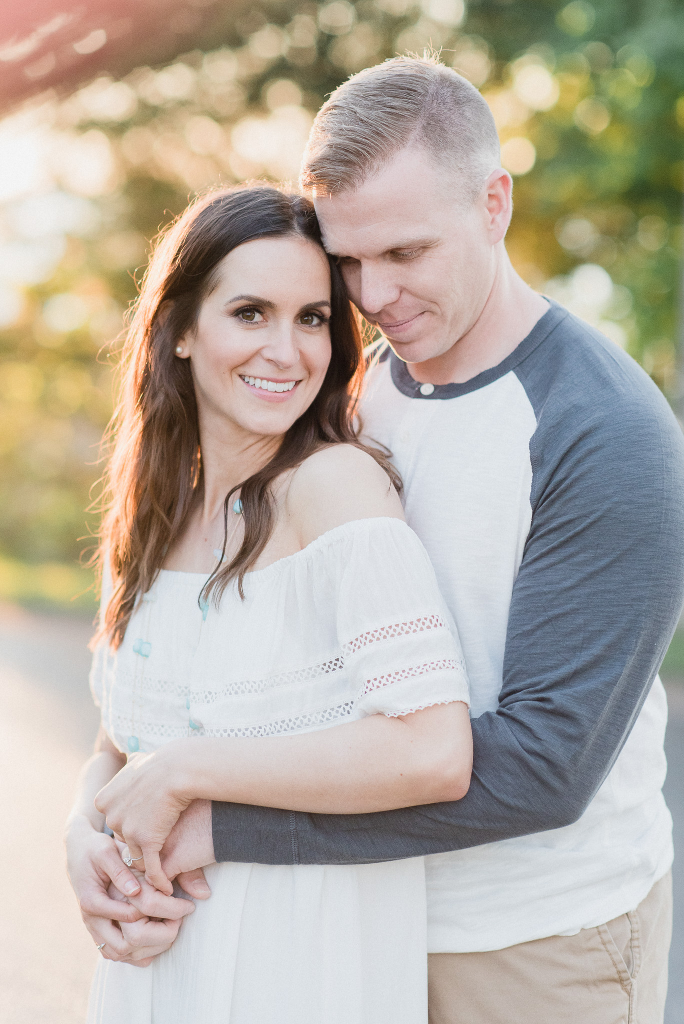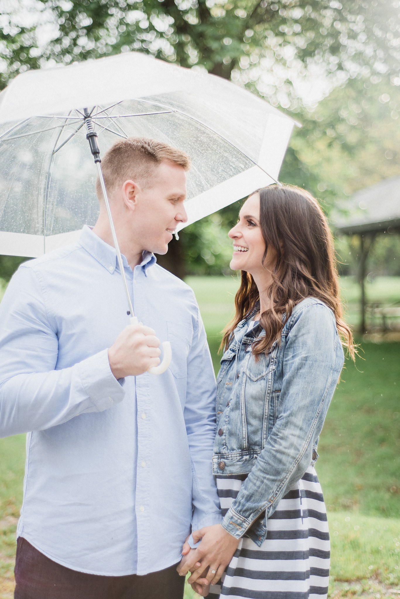 Luckily, I spend quite a bit of time deciphering the weather app on wedding and engagement session days, and as we sat there, I was noticing that slowly, the sky was lightening, the rain was thinning, and the birds had started chirping again. Kevin was pretty skeptical, he knew the look that Laura wanted for the photos and it didn’t involve rain and umbrellas. But, I felt confident that we could at least get some photos in, since we’d come all that way and they’d put so much planning into the day already, and I just knew the storm would break. I always carry umbrellas in my car for this reason (re: unexpected, last minute downpours), so out we went, side stepping puddles and huddling under the umbrellas. In the end, we spent only about 5 minutes doing photos with the umbrellas, and when the sky cleared, the sun came through the trees in all it’s glory, and we had a perfect session!