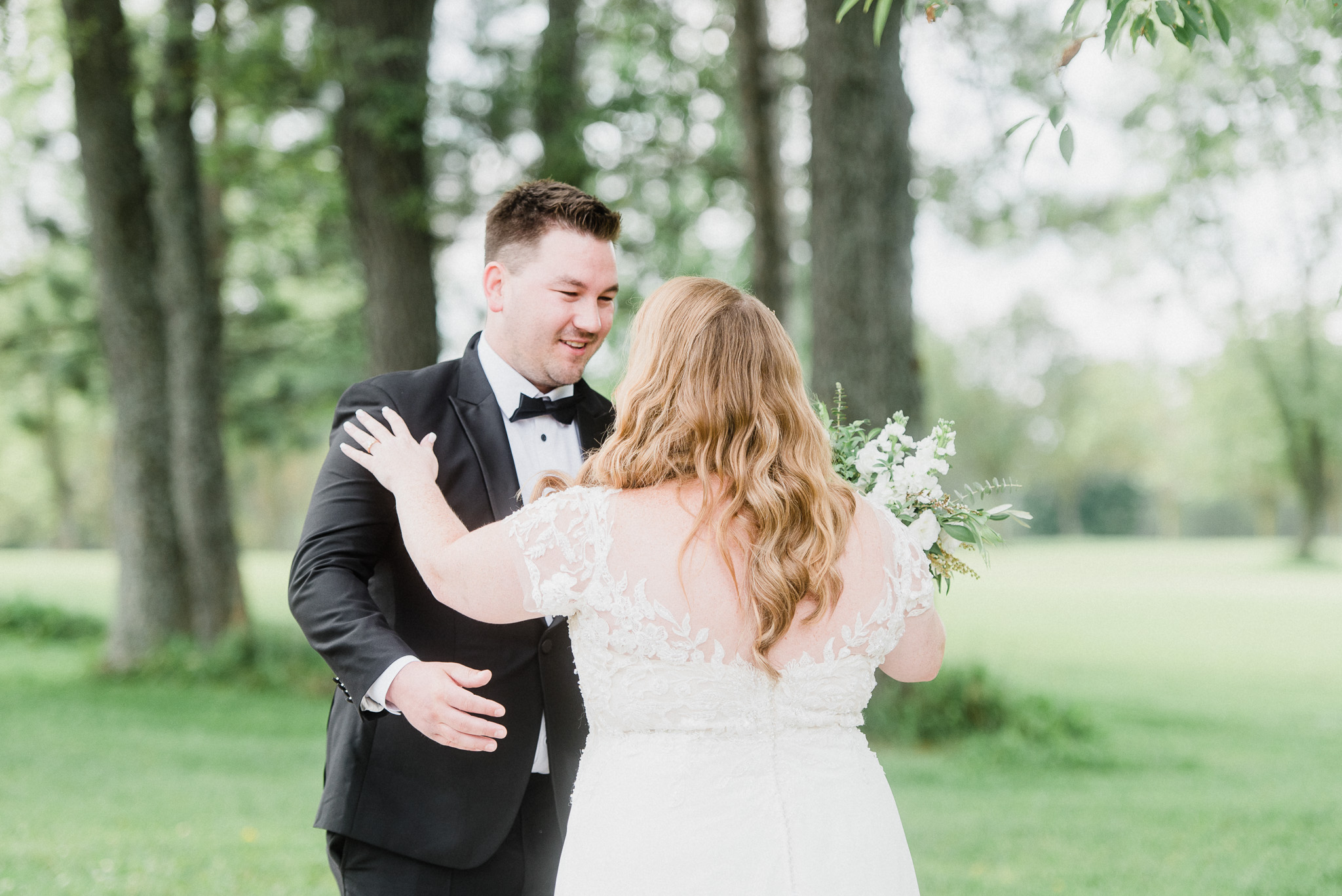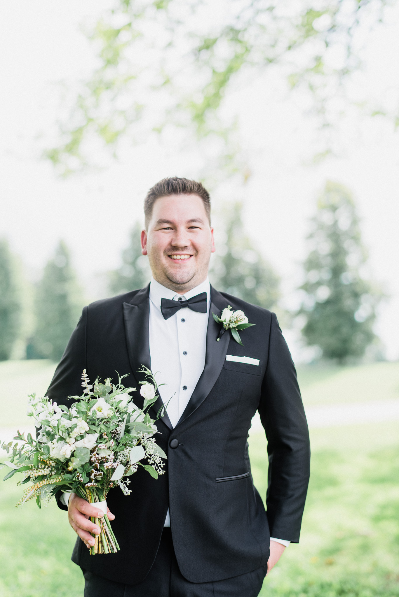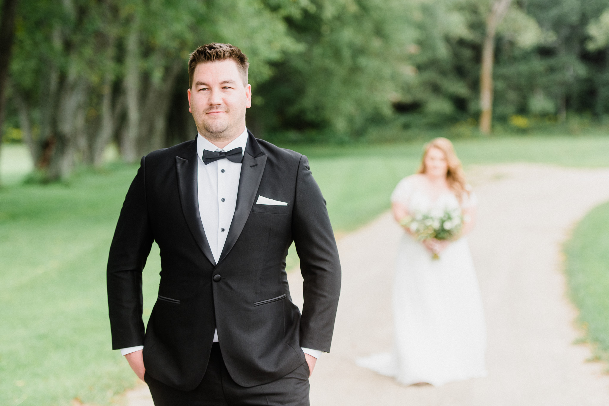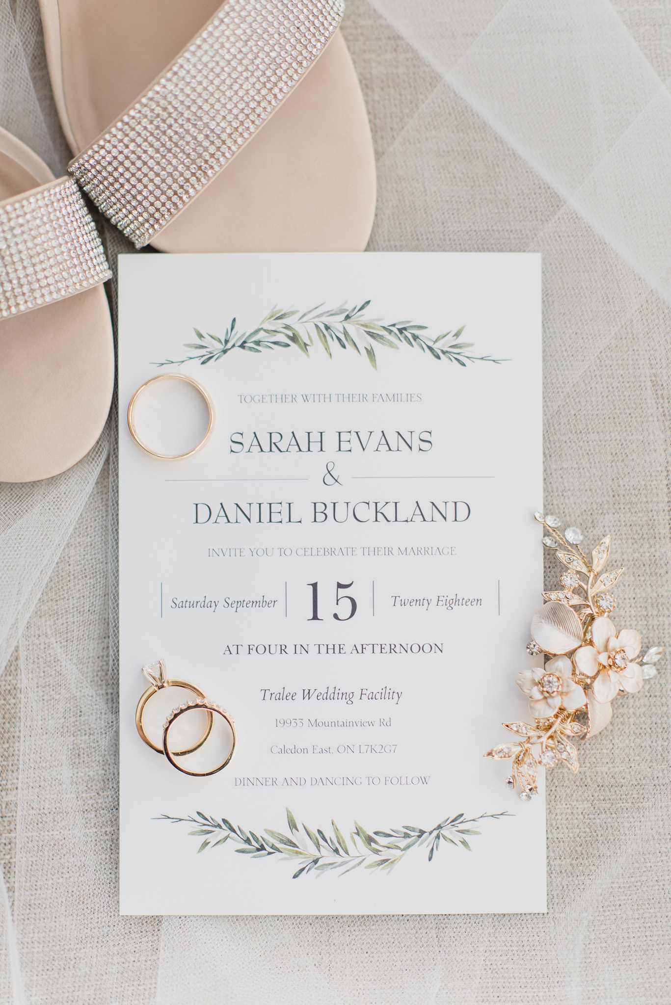 Now onto the good stuff: Sarah and Dan had a beautiful day at Tralee, and I am still so obsessed with the green and gold theme that they pulled off! It was a pretty toasty day but these two and their wedding party were such troopers. Sarah’s beauty team A Glow by Joan stepped in and saved the day after Sarah’s original plan fell through last minute, and they really knocked it out of the park! I love the glam look that they gave Sarah. And Dan rocked his fitted tux like a pro! The boxwood backdrop from Make Your Memories was accented by a gold Straight Laser crest designed by Plume Calligraphy. As always, Crumb & Berry served up the best sweet treats in Caledon. Cedar & Stone pulled together a stunning collection of greenery and dainty white blooms for the florals. See the bottom of the post for the rest of the team that helped Sarah & Dan pull this off!