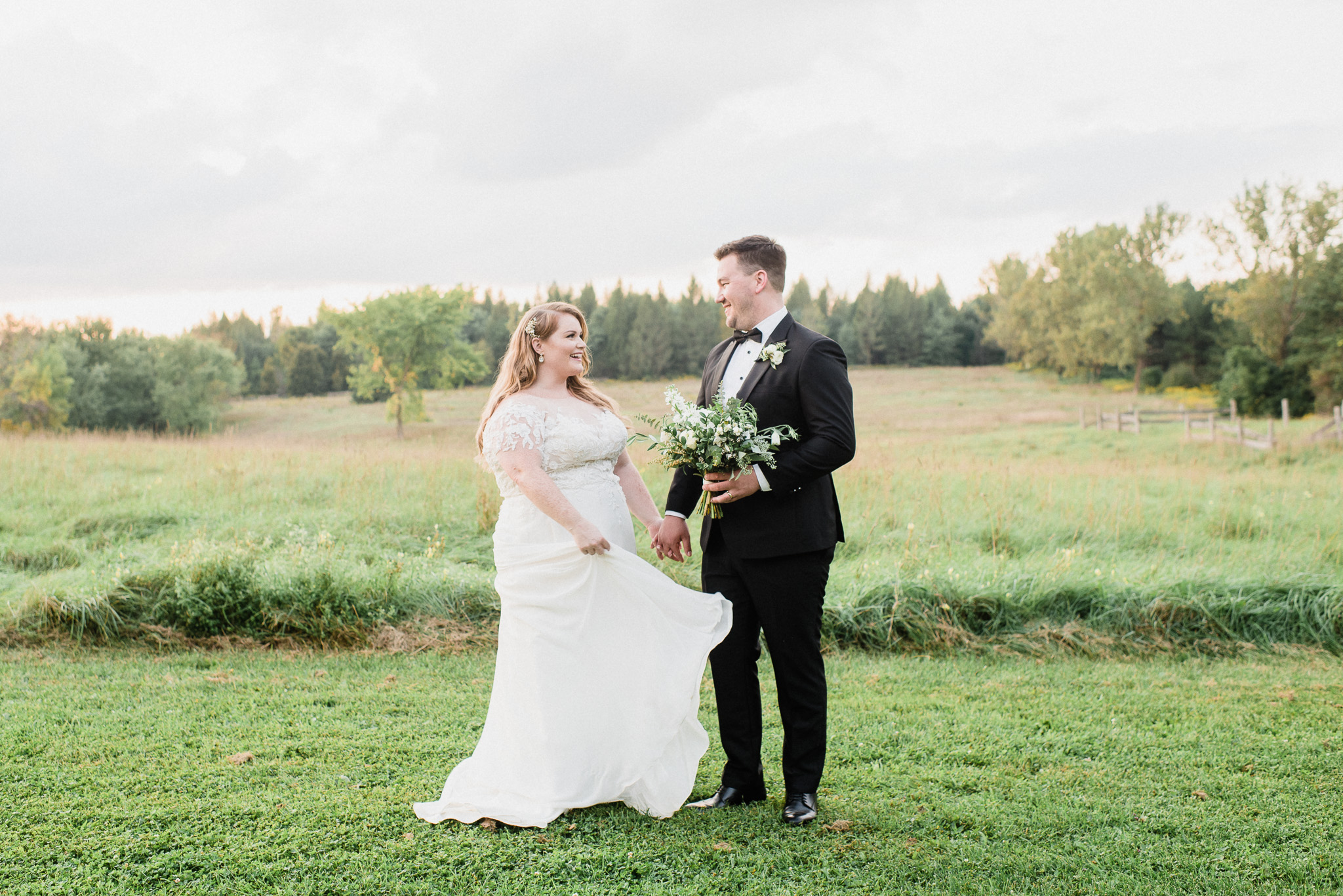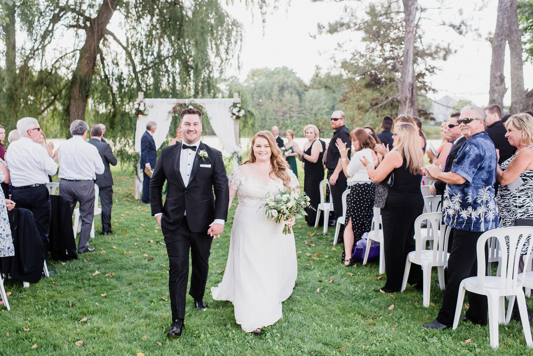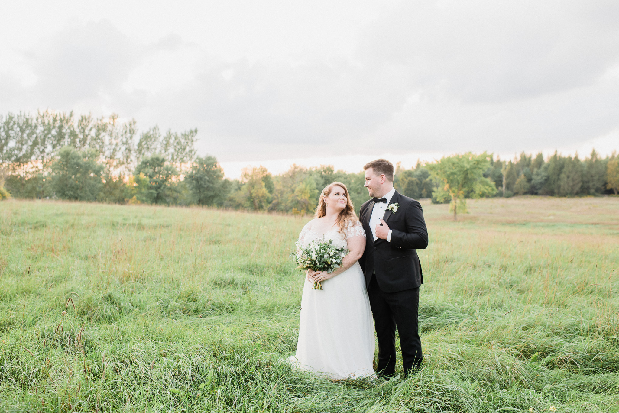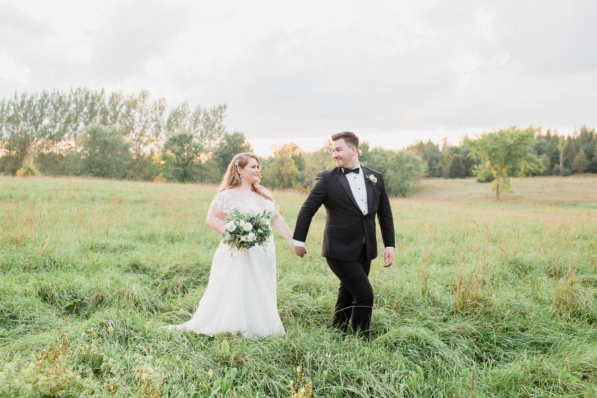 Now onto the good stuff: Sarah and Dan had a beautiful day at Tralee, and I am still so obsessed with the green and gold theme that they pulled off! It was a pretty toasty day but these two and their wedding party were such troopers. Sarah’s beauty team A Glow by Joan stepped in and saved the day after Sarah’s original plan fell through last minute, and they really knocked it out of the park! I love the glam look that they gave Sarah. And Dan rocked his fitted tux like a pro! The boxwood backdrop from Make Your Memories was accented by a gold Straight Laser crest designed by Plume Calligraphy. As always, Crumb & Berry served up the best sweet treats in Caledon. Cedar & Stone pulled together a stunning collection of greenery and dainty white blooms for the florals. See the bottom of the post for the rest of the team that helped Sarah & Dan pull this off!