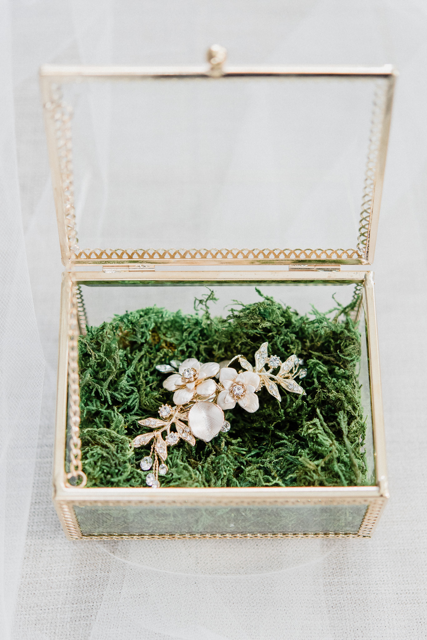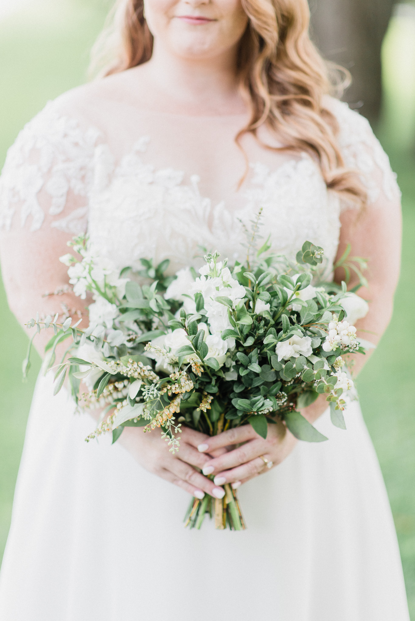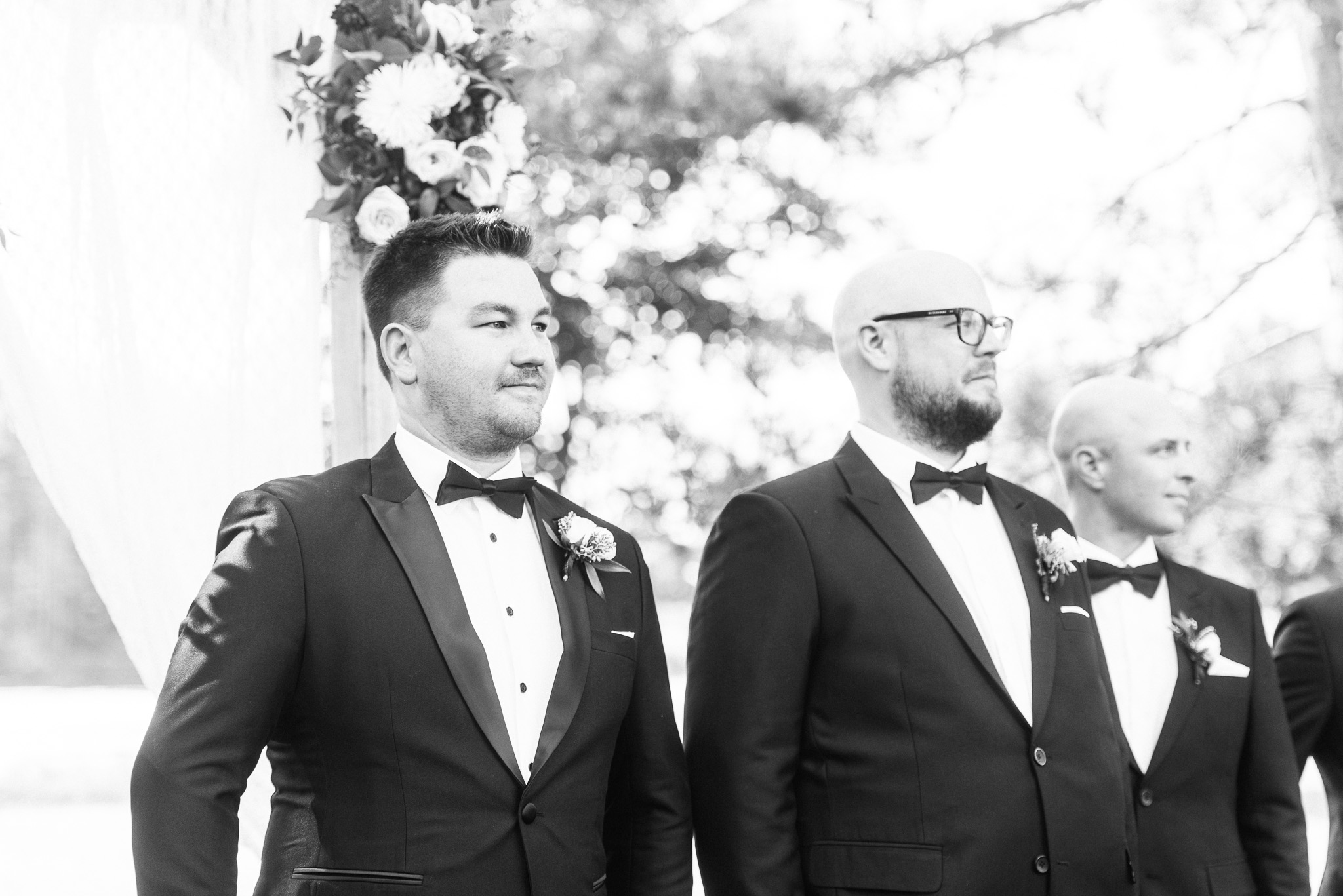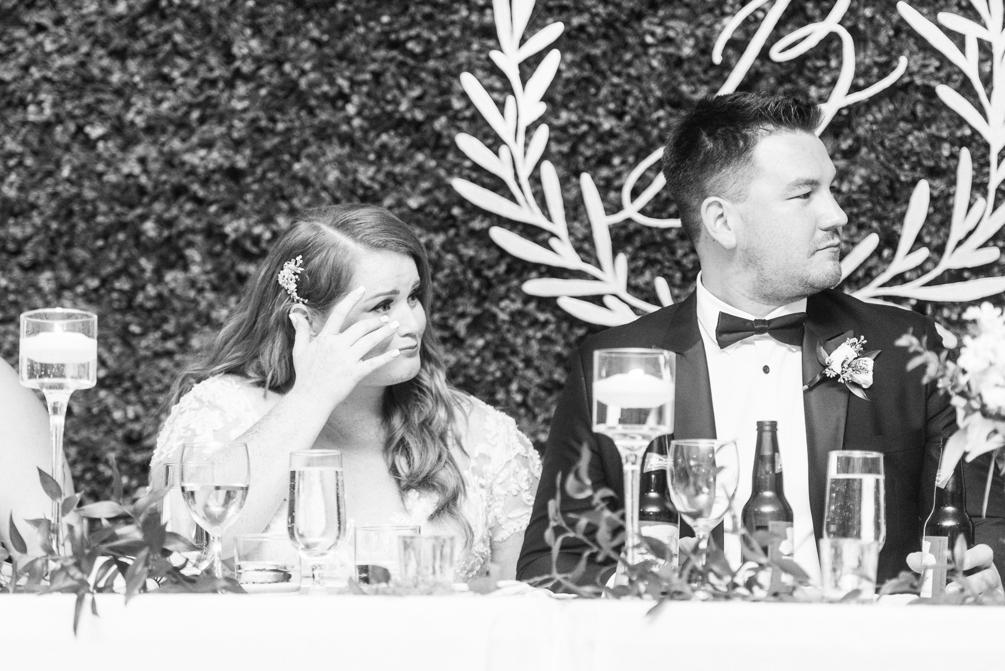 Now onto the good stuff: Sarah and Dan had a beautiful day at Tralee, and I am still so obsessed with the green and gold theme that they pulled off! It was a pretty toasty day but these two and their wedding party were such troopers. Sarah’s beauty team A Glow by Joan stepped in and saved the day after Sarah’s original plan fell through last minute, and they really knocked it out of the park! I love the glam look that they gave Sarah. And Dan rocked his fitted tux like a pro! The boxwood backdrop from Make Your Memories was accented by a gold Straight Laser crest designed by Plume Calligraphy. As always, Crumb & Berry served up the best sweet treats in Caledon. Cedar & Stone pulled together a stunning collection of greenery and dainty white blooms for the florals. See the bottom of the post for the rest of the team that helped Sarah & Dan pull this off!